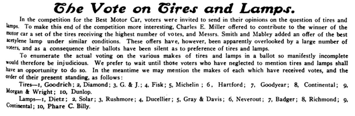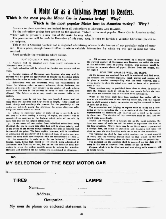 This is another magazine contest. This one was conducted between July 1904 and January 1905. The contest was simple, with the readers submitting a "coupon" with their top choice for "best" car, as well as "best" tires and lamps. Below is the "coupon" as well as general rules that appeared in each weekly issue: