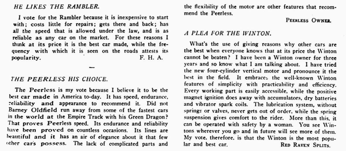 I used to put these type of stories up routinely (for those who indulged me). One of my earliest, and best was a magazine contest conducted in early 1907, in which participants in a "Motor" magazine contest picked the Ford Model K 5th of over 100 cars they would like to own (the top prize was a car costing up to $3,000).