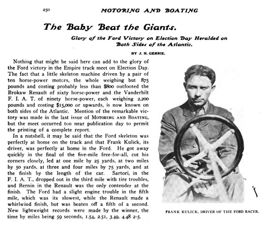 Also included in the issue was an article on American racing success, with a portion dedicated to Ford and Frank Kulick's previous successes: