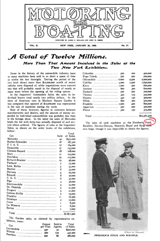 Below is an excerpt of the article above. Along with projected NY auto show sales are the projected sales of the leading automakers. While a few, namely Ford, Rambler, Stephens and Maxwell, didn't provide information, the number of autos the other leading companies projected for 1905 are listed. We know that Ford sold between 1700 and 1745 cars in 1905 (audit information). Based on the report of competitors, Ford was about to become one of the largest automakers in the U.S.. Not bad for a company in business less than two years.