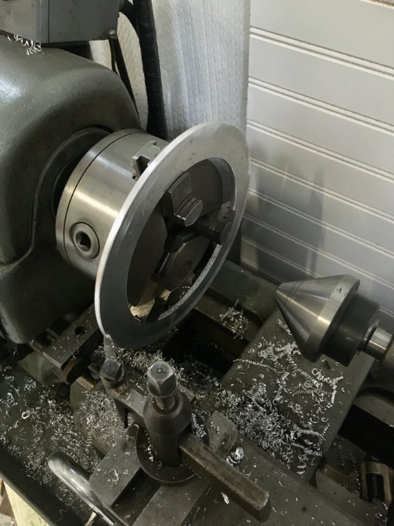 I tried my hand at building a Triple gear pin locking ring.first I cut a piece of 3/16ths aluminum plate.then turned the inner and outer dia in the turn table on the Bridgeportthen turned the outer dia to size on the Atlas lathethen turned the inner dia on the Clausing lathethen test fit to the flywheel