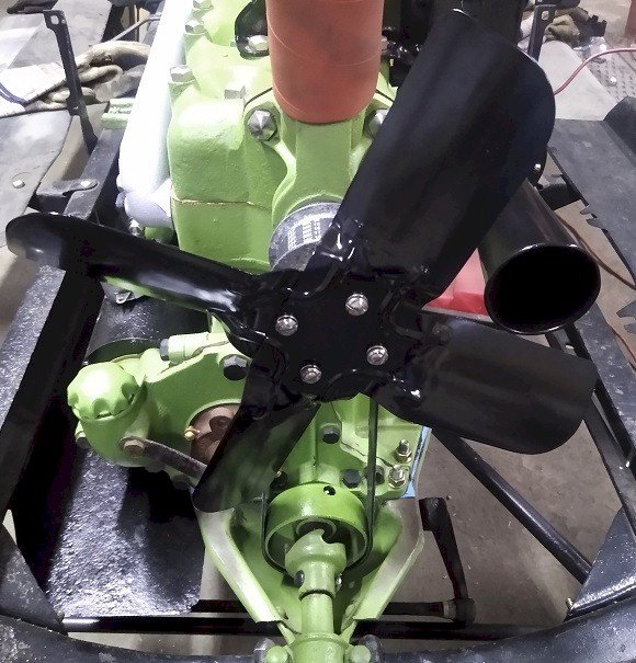 There were only three screws for the fan and one of the threaded holes was gacked up & malformed...explains the missing screw. So, I chased the threads and may have inadvertently upgraded a size #14 for a 1/4" for all four holes. Found some 1/4" Philips round heads and converted them to slotted. After the center bolt was tight, I cranked it several times and the belt runs true. The belt has not yet been tightened on the pulleys and won't be until it's time to run the engine. I lubed the bolt before insertion and already had drips from the back side on top the crank pulley below.