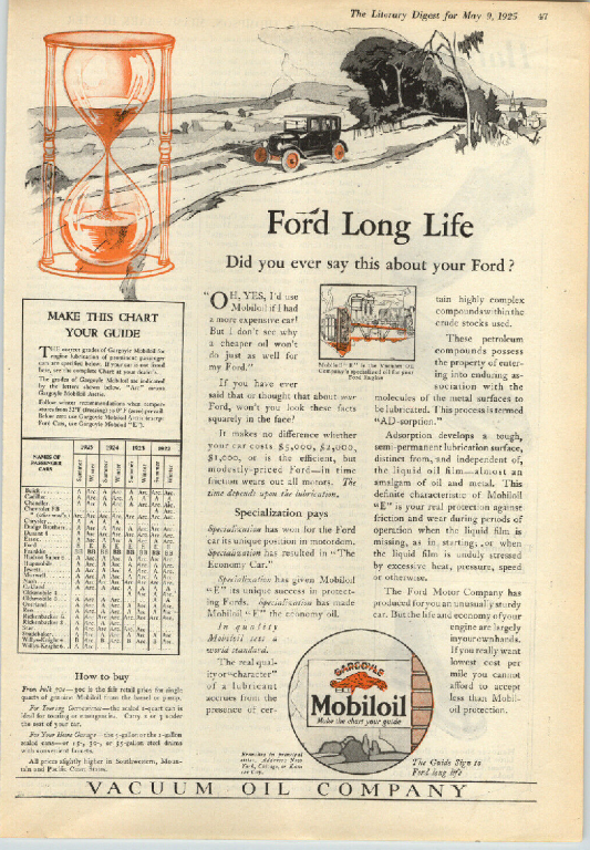 I received the email below from a relative helping to restore an antique fire truck. Our fire department is restoring a 1923 Seagrave pumping engine. It is powered by a 6-cylinder, "T" head gas engine displacing 1720 c.i. We have found a copy of the lubrication manual from that era. It was prepared by the Vacuum Oil Co. of New York in collaboration with Seagrave. They recommend "Gargoyle Mobiloil" grades A, B & C for the various driveline components. Could you provide the current equivalents to these lubricants? Any direction or information will be greatly appreciated. Thank you, Monessen VFD #1 In my research Type C is the currently available 600W, however an equivalent to Type A and B eludes me. I know Type A is recommended for winter use and B for summer. The engine has been completely rebuilt so sludge will not be an issue. The flat tappet design may be an issue with new oils with reduced ZDDP. I contacted TechSupport at ExxonMobil with no results. I was thinking of Rotella 15w-40 with a break-in additive. Opinions and data would be appreciated. Thanks