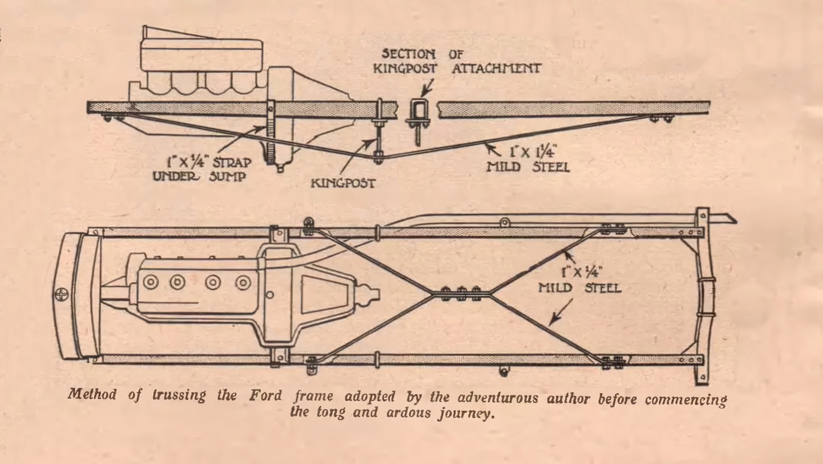 I have found a reference to Michael Terry's drive across trackless Northern Australia in a modified Model T. He and his mate were the first people to drive from Queensland to Western Australia (the Pacific to the Indian Oceans) across the top of Australia. Here is the design of the strengthening trusses he used on the chassis. (There is an obvious mistake on the drawing which you will spot!) Adding trusses like this were quite common on heavier English cars which had relatively light chassis. Has anyone ever seen a design like this on a car?