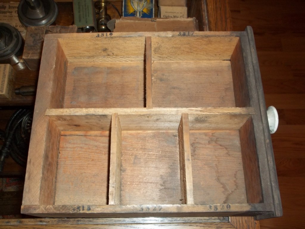The shelves stand seven foot tall and are built in six foot sections. They weigh around 300 pounds each and are constructed from soft wood with not one knot in the wood!! They are stained a dark color and have wooden drawers for small parts. The drawers have the Ford part number stenciled on the drawer faces. In the drawers, the part numbers are stamped above each area where the small parts are placed. The open bins are stenciled with the Ford part number so the correct part can be easily found. I have compared the part numbers found in the [uFord ]Price List of Parts[/u]from 1915 and 1916, and they seem to match the part numbers found on the shelves.