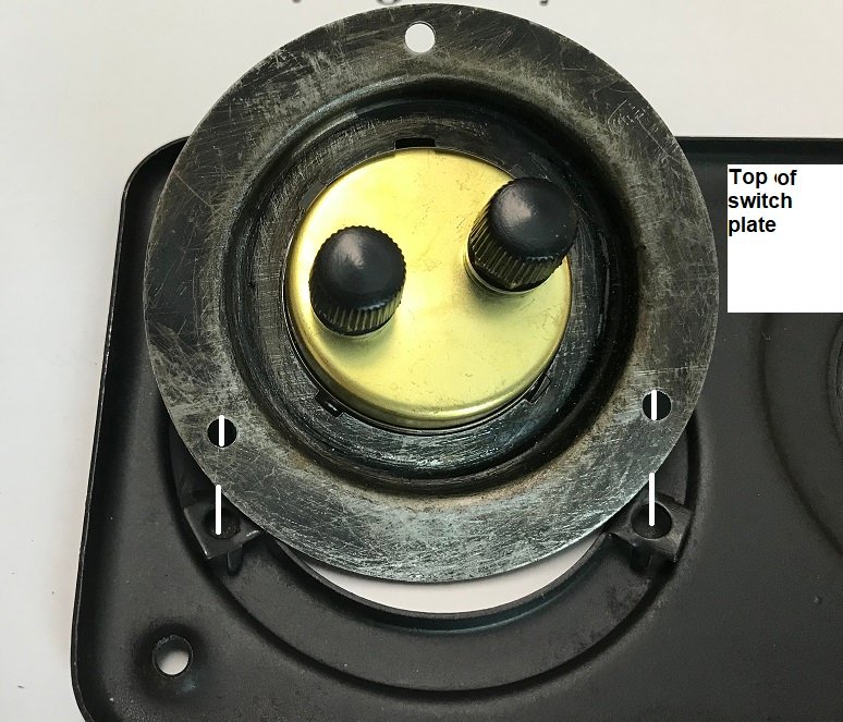 Now position the adapter plate 3 holes with the back of the switch plate. The hols are offset so there is only one way to do this. Be careful when tightening the screws to hold the adapter plate. If to long they will dent the front of the switch plate