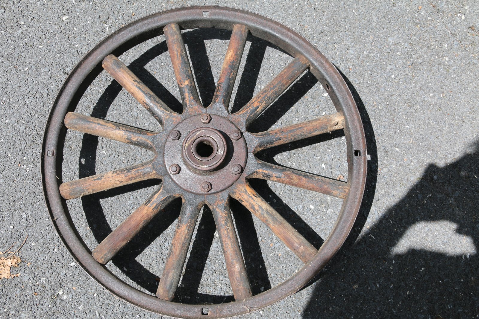 I purchased this split-rim wheel from a local auction, thinking it was probably for a Model TT given the 1/2" wide dual key slots. The wheel measure 23" in diameter and the rim 2". The hubs are 6" in diameter and appear threaded for a Model T hub cover.