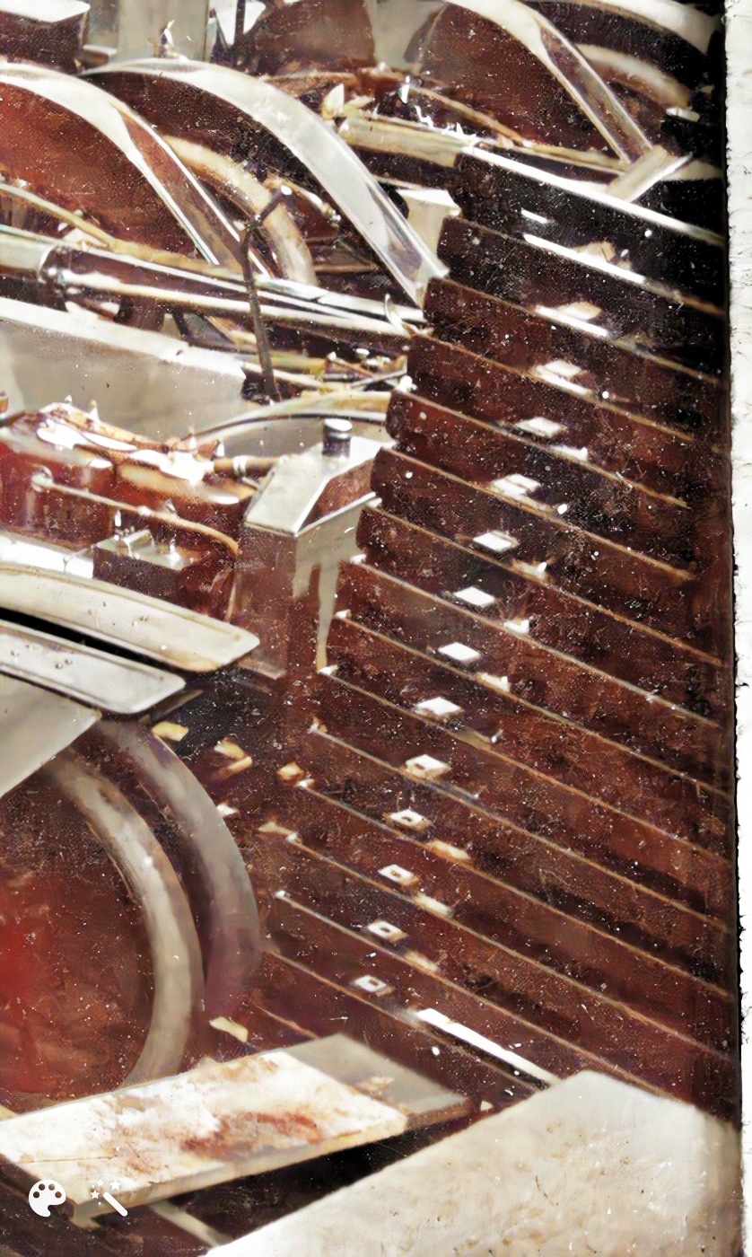 Below: colorized portion of Piquette photo, summer 1998, showing Model T frames stacked up in the yard. Original photo, courtesy of THF, all rights apply: