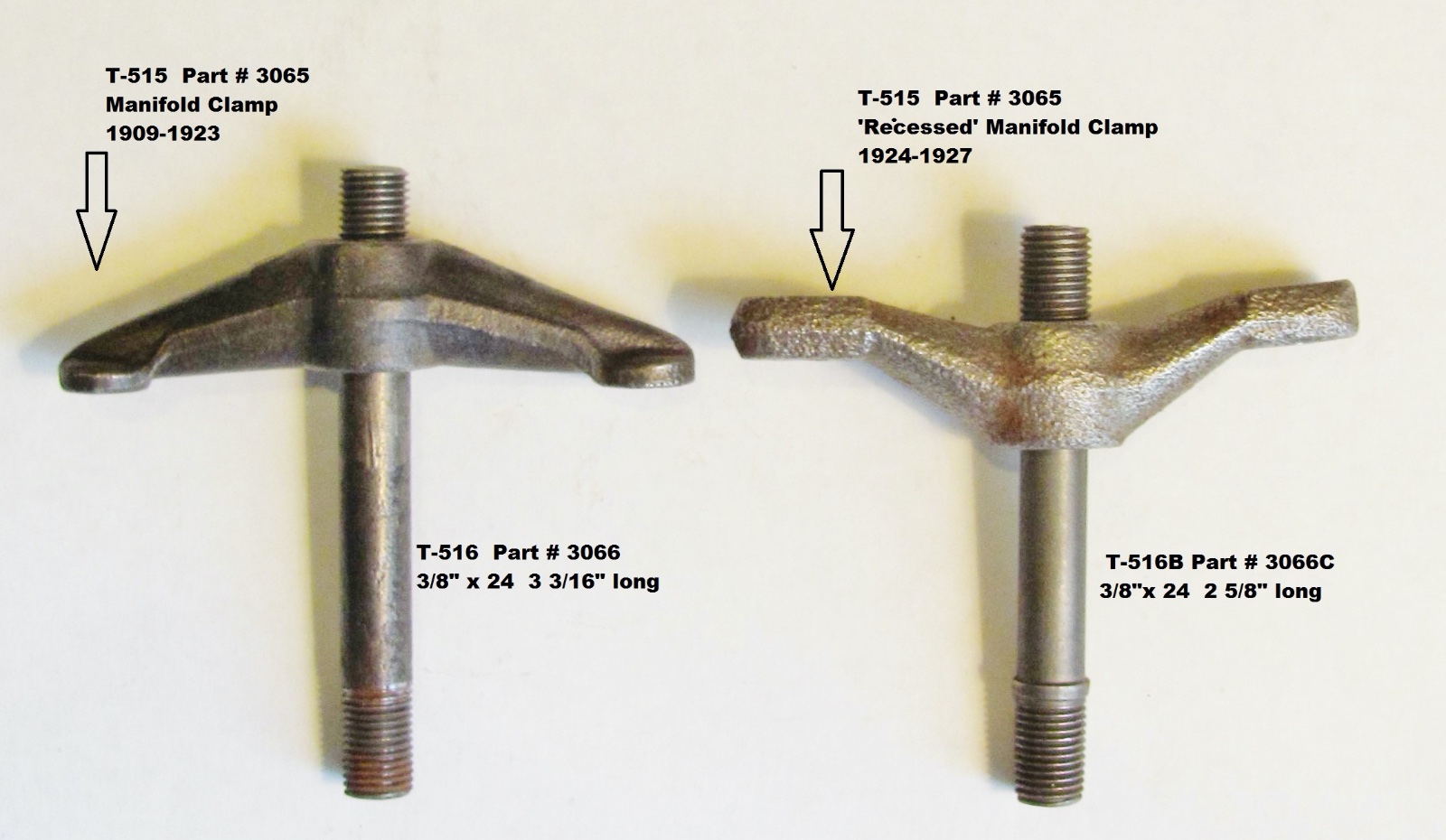 The neat thing about the later clamps is they can be used with the early long studs by just reversing the clamp. So this late design meets Henry's criteria for new parts, since the part numbers didn't change.....they can retrofit earlier T's