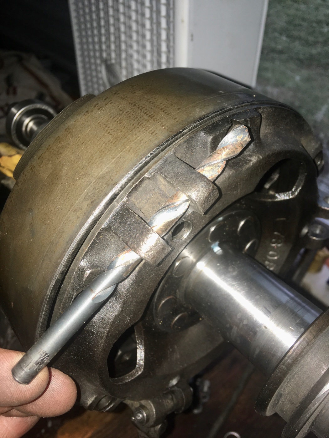 The distance between opposing screw holes on the wheel gear is 6 and 1/2 inches. I drilled the quarter inch hole for the threaded bolt half that distance from the center of the spindle with the bolt installed in the spindle held in place by the nut. I cut plenty of threads on the end to make adjustments.