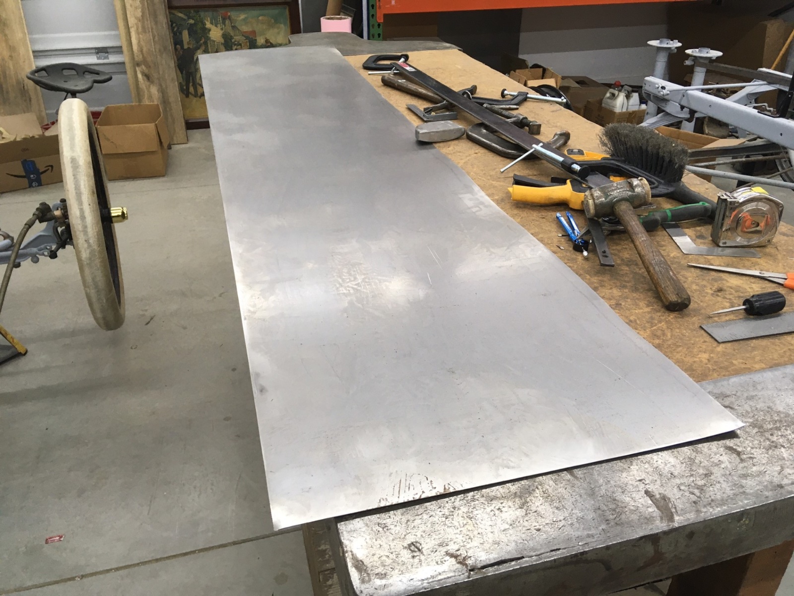 I use an electric hand shear to cut out the part.Using the strips I knock the straight stretches up with the rawhide and then straighten the edge with a steel face hammer and dollie.