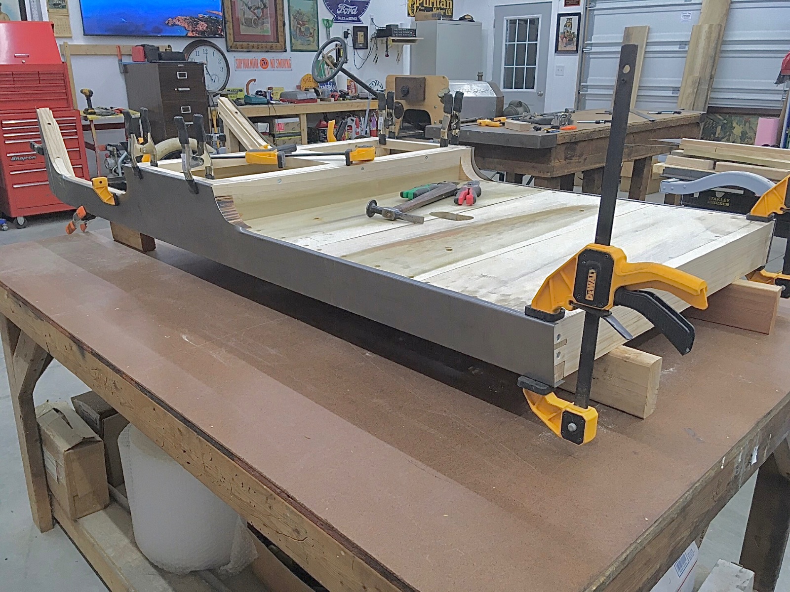 Since I don’t have a 8’ brake at home, I sandwich a 1” flange between two 3/16” strips and knock down with a rawhide hammer, checking to see it is approx. 7 degrees short of 90.