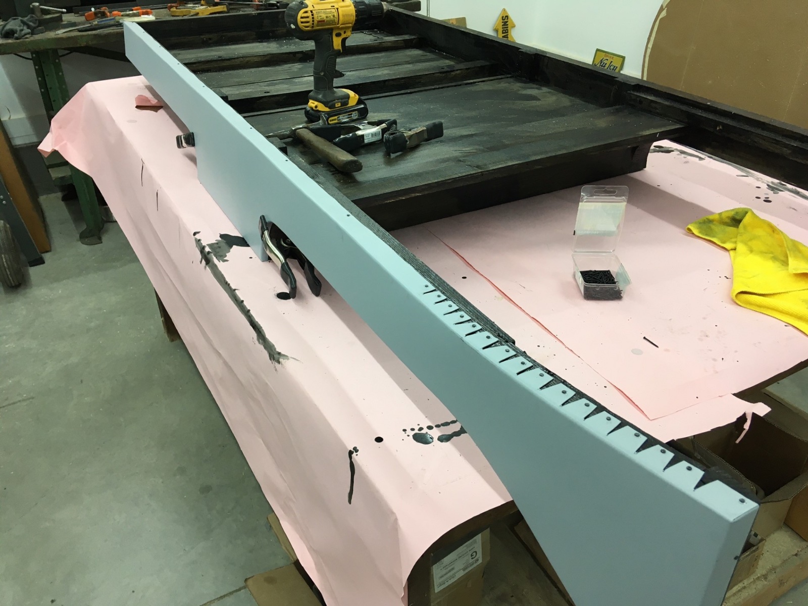 Took the sheetmetal off and sealing the woodwork with black lacquer. Now waiting for plates from the steel guys.