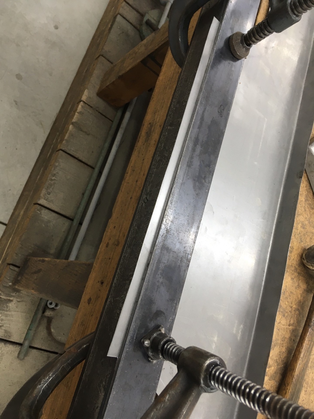 Since I don’t have a 8’ brake at home, I sandwich a 1” flange between two 3/16” strips and knock down with a rawhide hammer, checking to see it is approx. 7 degrees short of 90.