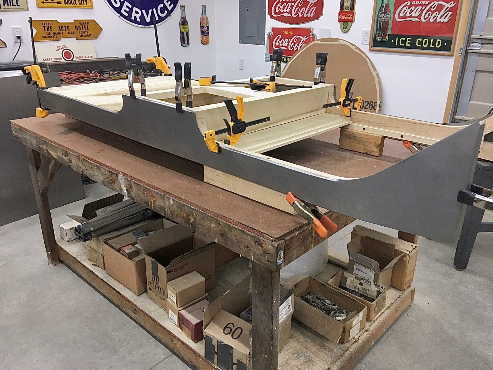 I had to bend aluminium moldings for my 1912 van and my 1925 wide body roadster, and used a wooden former like yours for each, but with a slight difference in technique. I cut the formers to the OUTSIDE diameter of the curve needed. Then I used my table saw to cut a grove around the curve. The cut was set to the depth of the molding width. I had to do two cuts side by side to get the groove as wide as the molding was thick.
