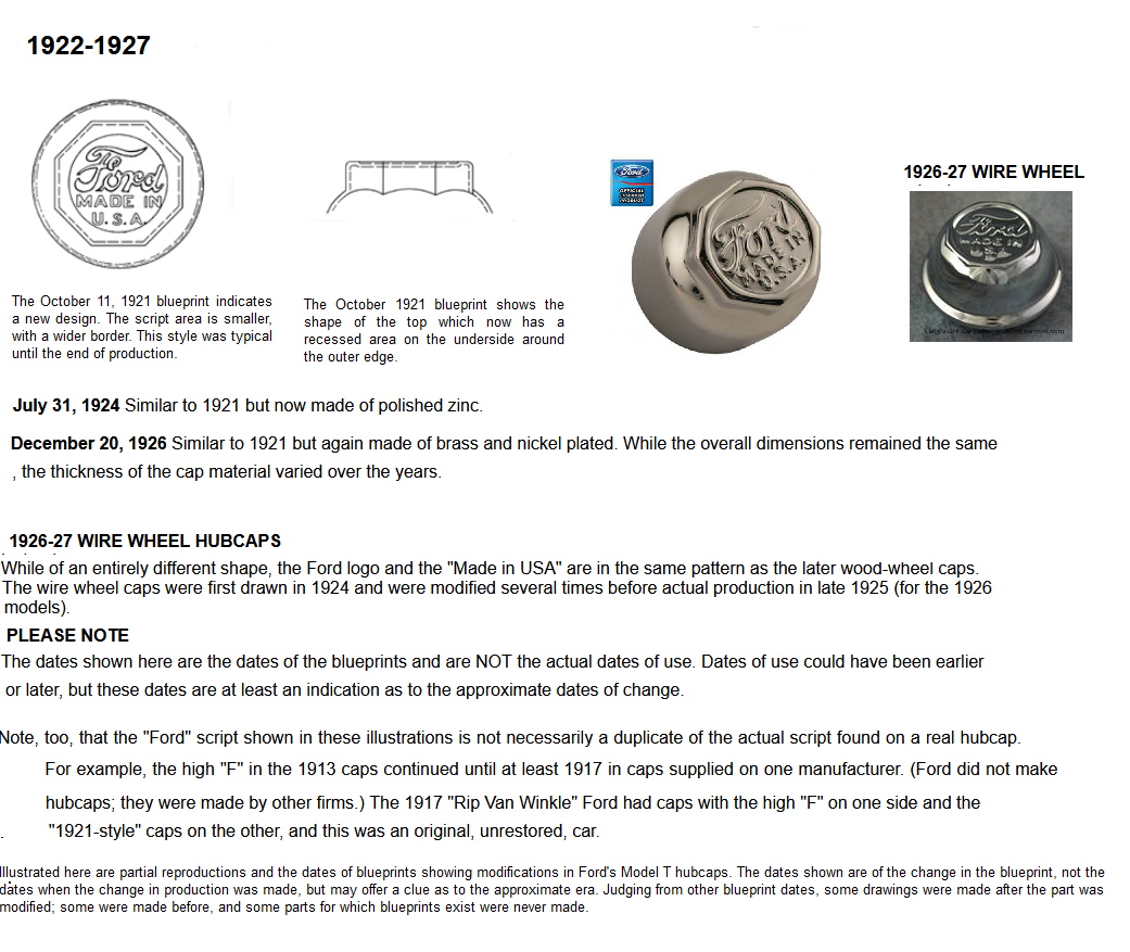 I have had two 1917 High F scripts hubcaps. The first one I had I gave to Russ Furstnow when he bought my 17 Coupelet. The script was identical to the 1916's used previously, and first introduced in 1914. The one I gave Russ had no plating in the script area, indicating the plating was done after the black center. The one I have now has two areas that are still shiny nickel. No nickel in the center area as the other. I've not seen any 1918's to see if they still used the high F then. It would be nice to know. As some of you may know, the 1913 hubcaps are similar, but have a bolder F, as the one Dan Hatch posted this morning on the forum.