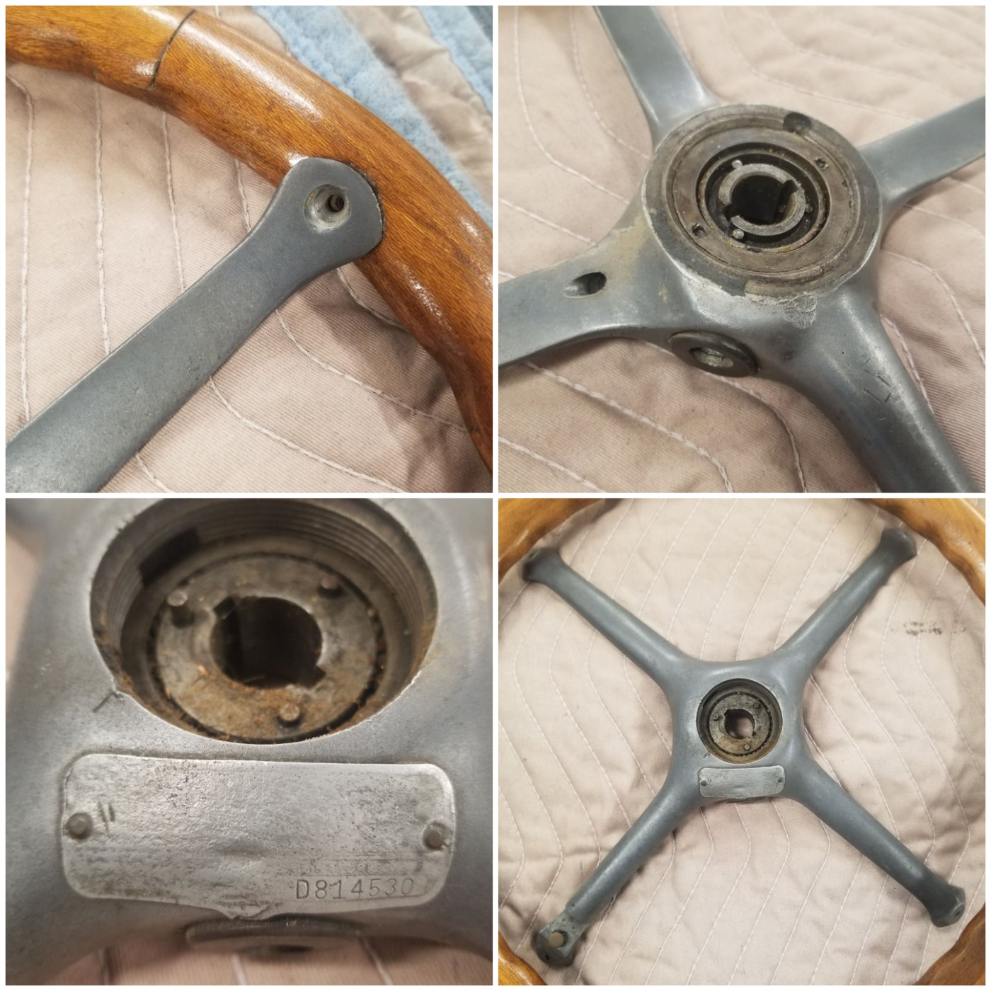 One of the many parts being giving to me with the 25, is a Fan man steering wheels. First thing I noticed is that he lost the screws that hold the wood rim on. Now that I've had a good look at it, the center hub seems to be missing a screw in badge? I also don't know what else is missing to make it function.