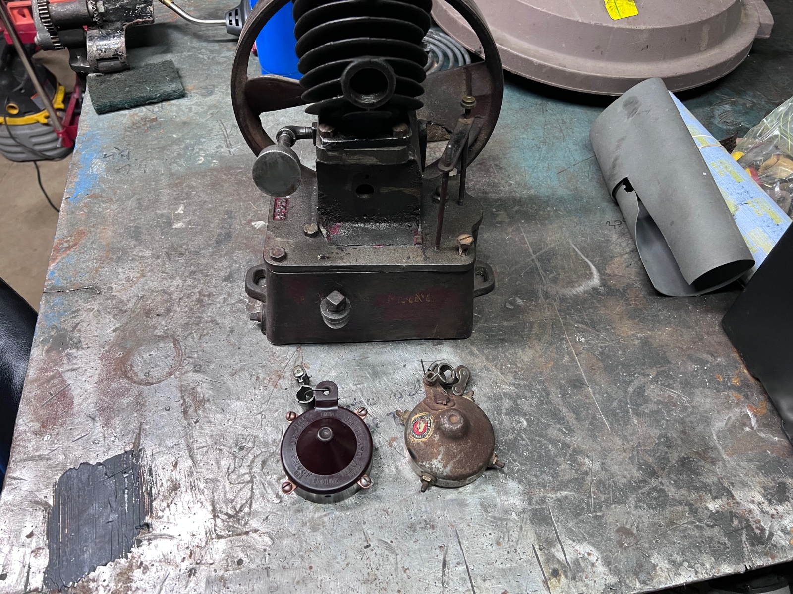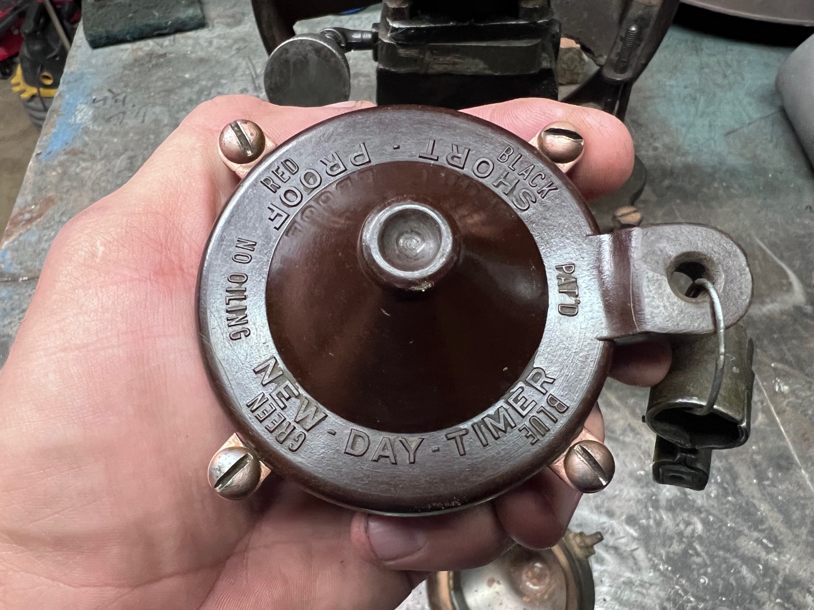 The New Day timer is a keeper and seems OK but the roller timer is in worse condition. The fiber insulation ring on the inside of the case is cracked and may not be usable. But what’s interesting about the roller timer is it’s still got the remains of the brand sticker on the outside of the case. You don’t see that very often. You might keep it for that reason.