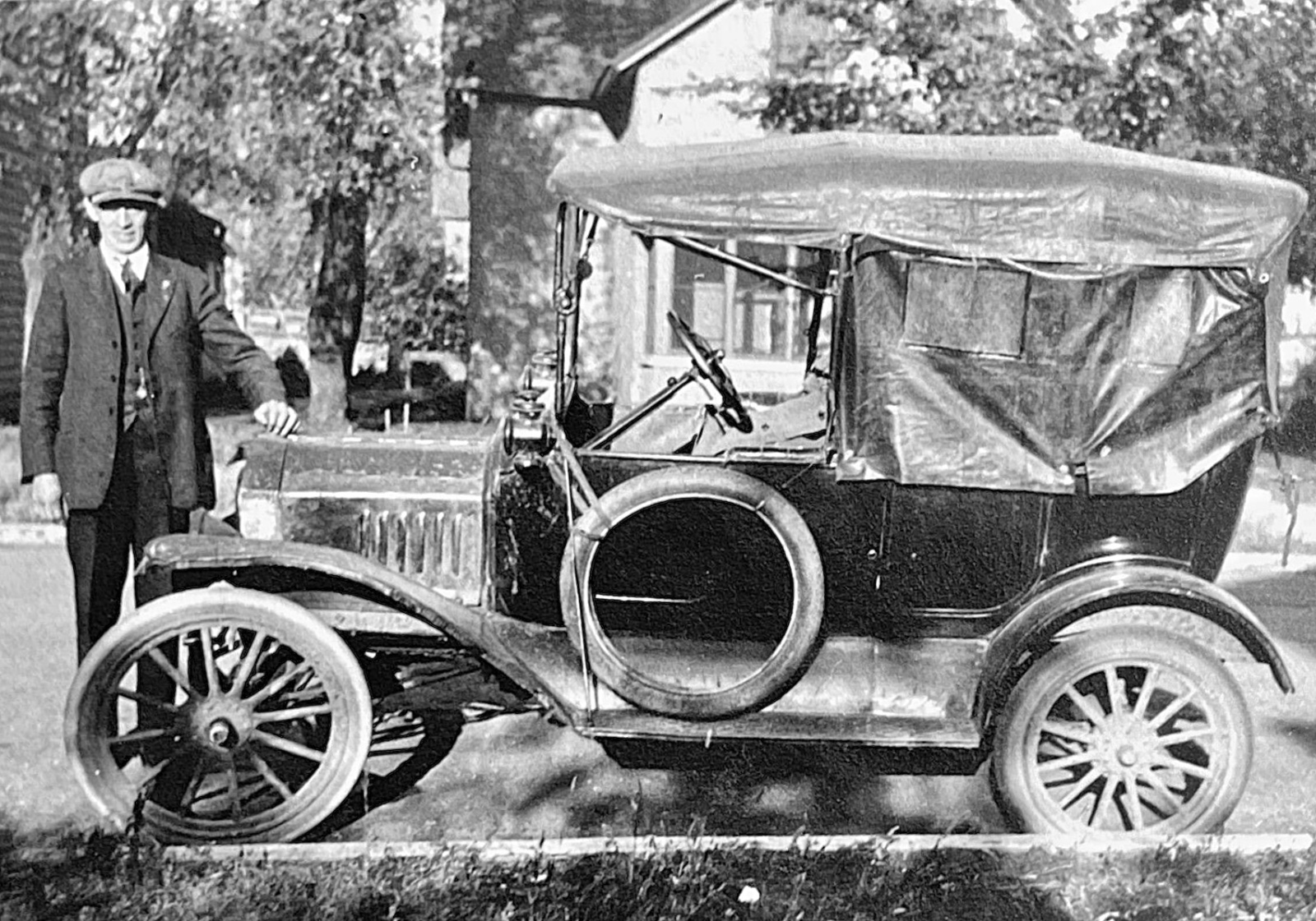 Two 1915/'16 Ts, a roadster with a peddler's box and a touring car, both appear to have a blacked out brass radiator. Just an unusual observation. The touring car clearly has an electric horn button, so likely a late 1915 or 1916 car.