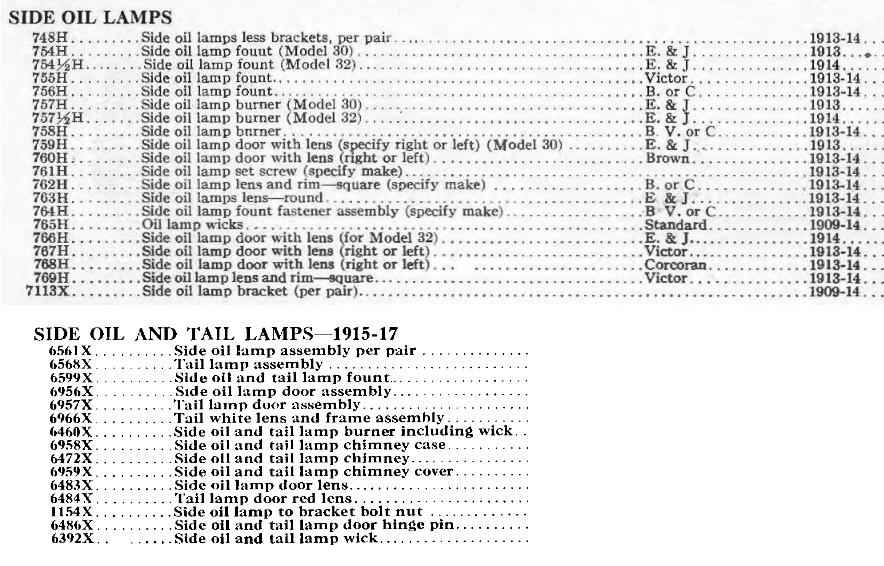 Here is some information from Ford Accessory Parts manuals & The Model T Encyclopedia (old & new). The issue I see is that there were many versions of oil lamp parts mentioned for 1913-1914 as unique part numbers but the parts diagram only referenced a generic part number. Referenced 1916 & 917 Accessory Parts manuals. Oil lamp bodies and are not referenced but if parts for Brown, Victor & Corcoran are specified would it follow that those lamps were used in years 1913-14 & possiblelater till inventory was used up?