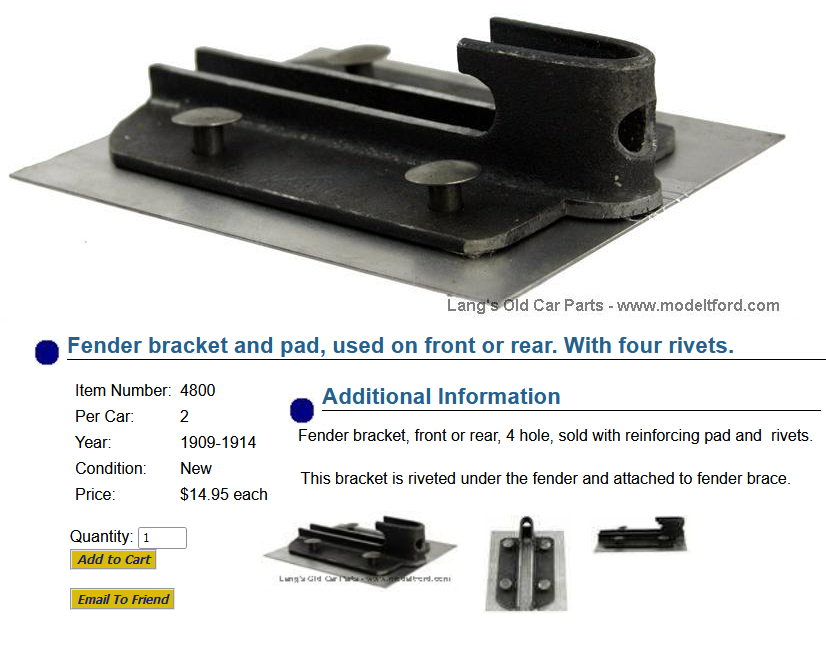 After searching awhile for original mounting brackets for my early 1915 front fenders, and not finding any, I decided to make my own. To that end, I bought a reproduction rear fender from a 1914, that someone had used an original mounting bracket on it. The fender had been damaged in a minor fender-bender, and replaced with another new one. So I got the damaged repro with an original four rivet bracket on it! After careful measuring and some research, I decided the bracket on that fender was close enough to use on the front fenders (maybe someone can tell me now that I screwed up?).