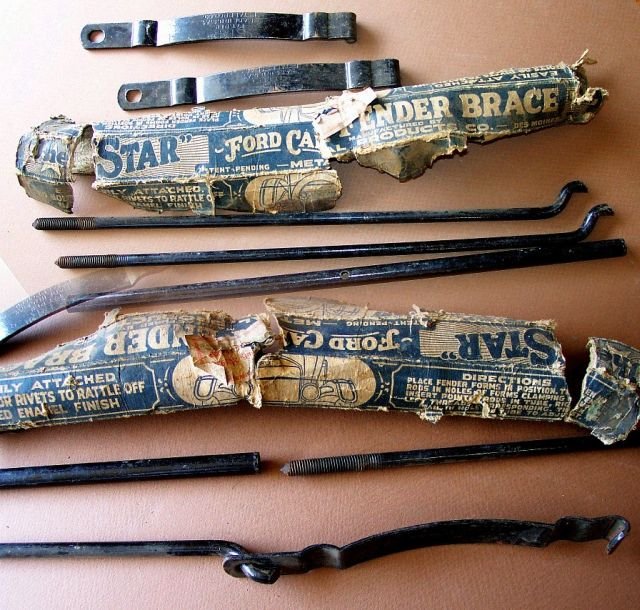 I have at least a half dozen sets of front fender braces. These were sold back in the day because the front fenders tended to droop a little or sometimes a lot. Usually because of loading items on the fenders, posing for pictures on the fenders, tying the big dead bull moose to the fenders, or, ** add your reason here**. Sometimes people don’t even realize their fenders droop until they install one of these. These sets vary from complete NOS sets, complete sets with new metal rods, and even some orphans ends for the doityerselfer. I’m thinking $80. All the way down to $10 for the orphan ends, depending on what I have and what you want. These look great as is on a barn find or unrestored car or TT truck, and also serve a great purpose to straighten up Lizzie a bit. Let me know what you may be looking for, and I’ll send some pics. Tmorsher@icloud.com is the only way to get in touch, unless you knock on my door which I will not answer. Thanks!