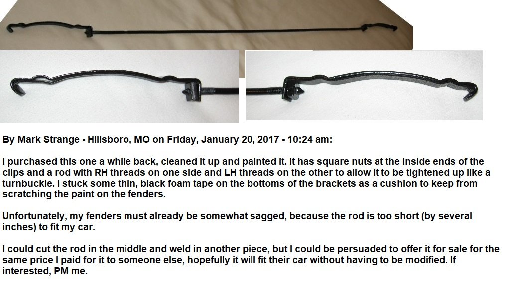 Does anyone make a repro of the fender brace that runs across the front of the radiator and clamps on to the outer lip of the front fenders (it's the 25 I'm talking about) ? If someone is making these I would like to surprise my customer, this car has tons of other accessories on it and the fenders have drooped....