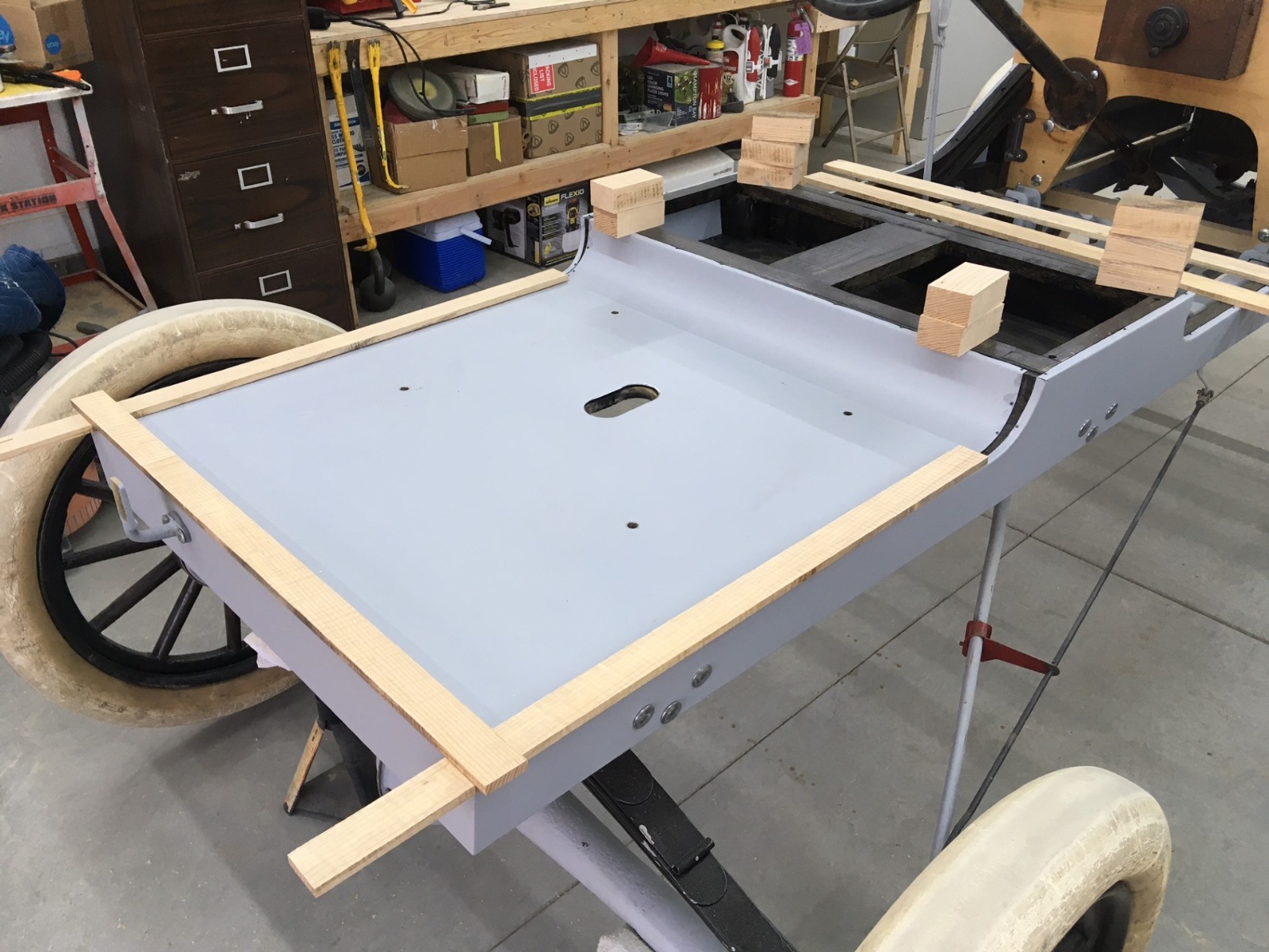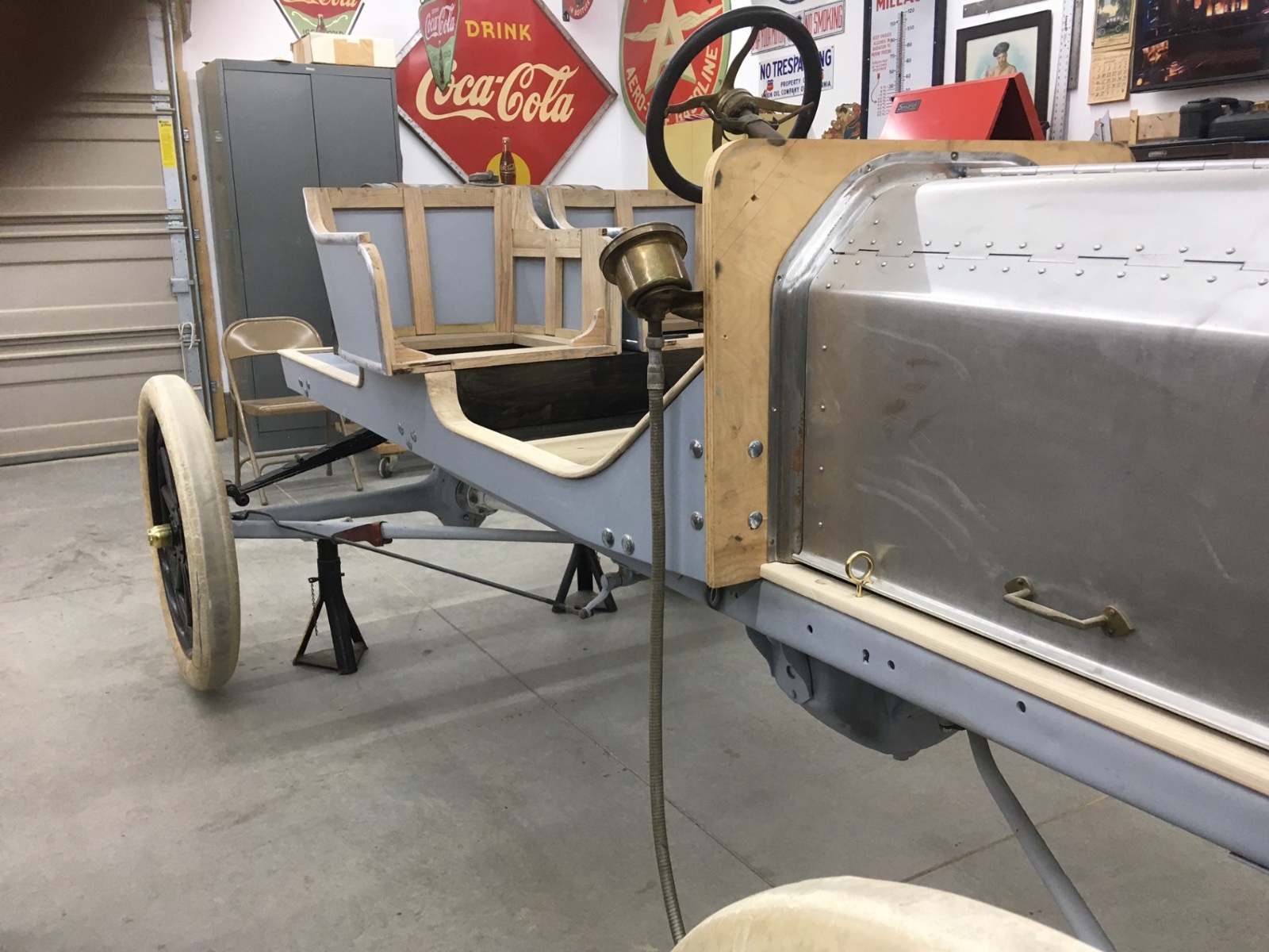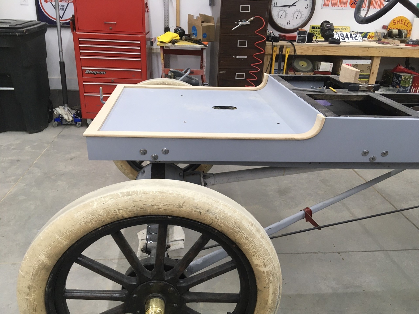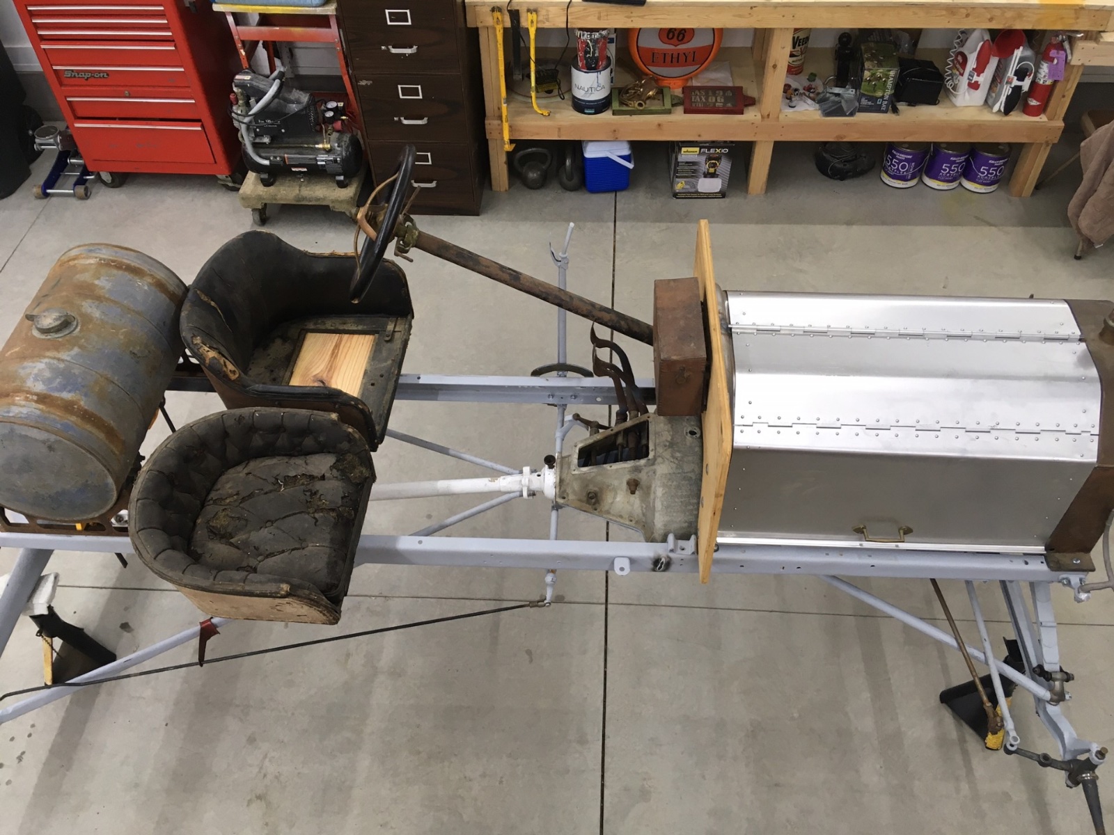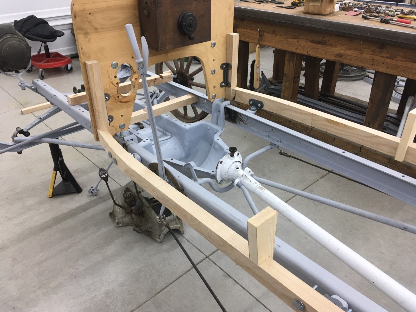 Well, I moved this to Ohio and have started to place some parts on the chassis to get a feel for what to do for a body. I like the basic feel of the spacing, but it needs a body platform of some type. Step in or step over. Flat dash or scuttle cowl. Tool box or ? on the tail end. Suggestions most welcome.