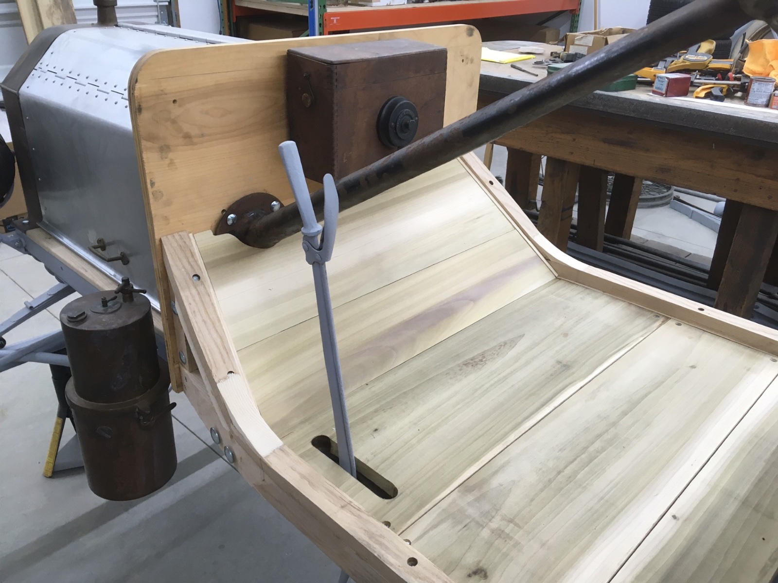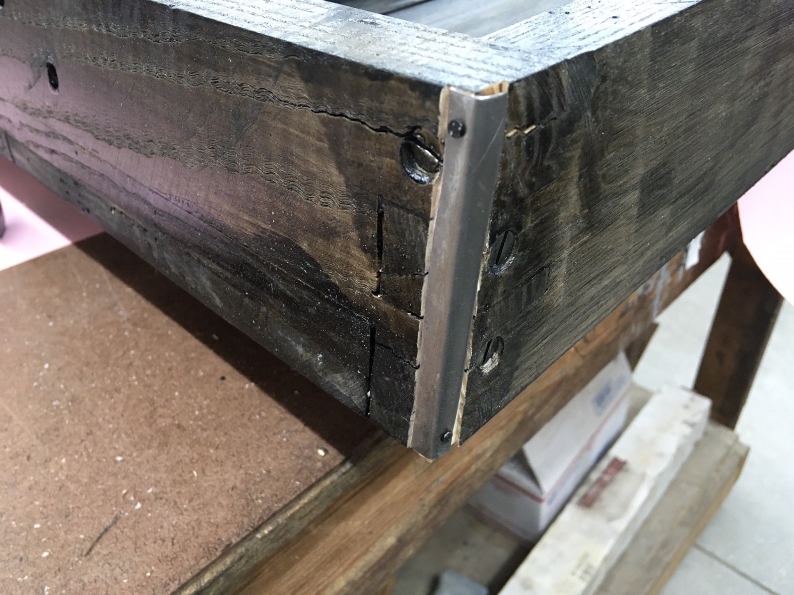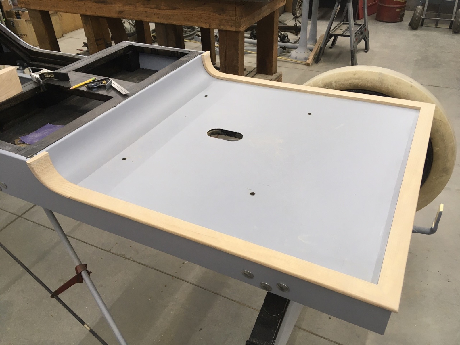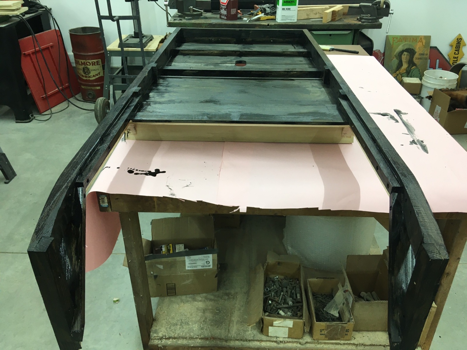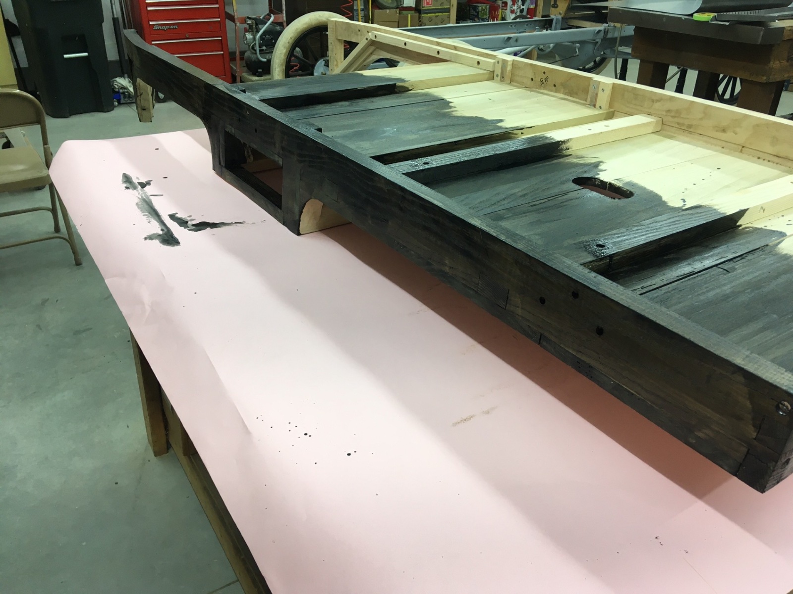 Took the sheetmetal off and sealing the woodwork with black lacquer. Now waiting for plates from the steel guys.