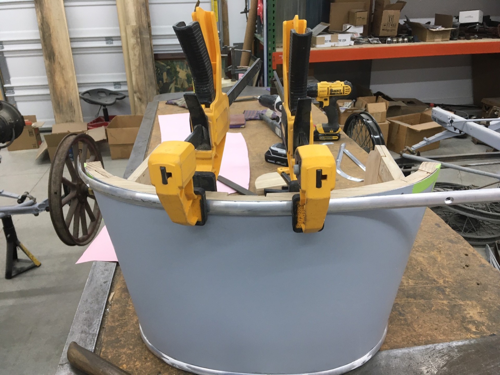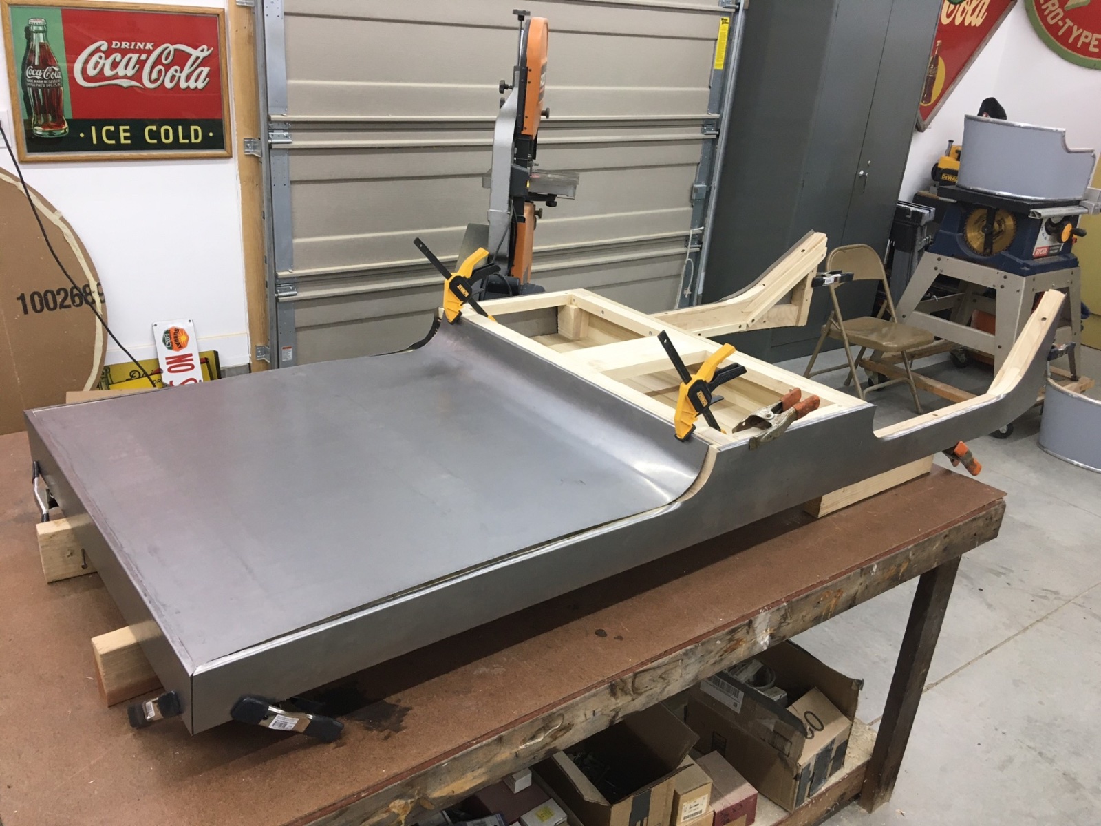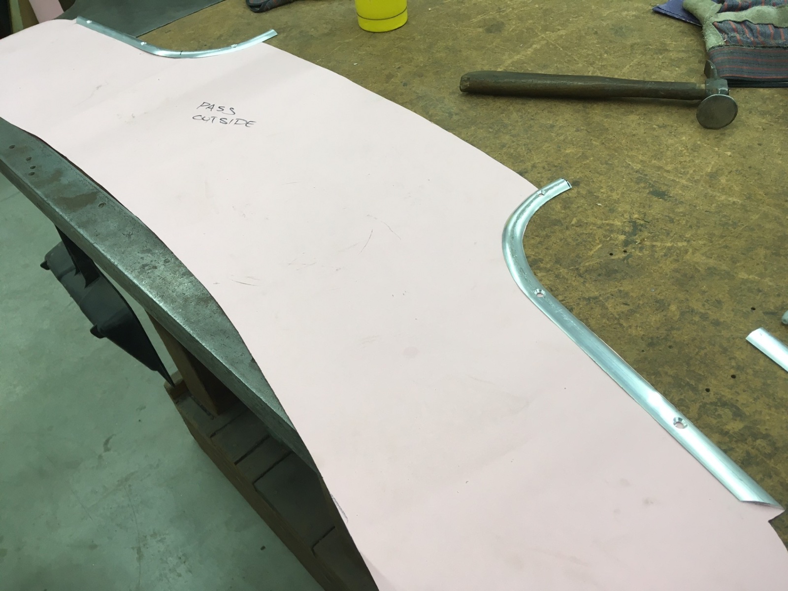I had to bend aluminium moldings for my 1912 van and my 1925 wide body roadster, and used a wooden former like yours for each, but with a slight difference in technique. I cut the formers to the OUTSIDE diameter of the curve needed. Then I used my table saw to cut a grove around the curve. The cut was set to the depth of the molding width. I had to do two cuts side by side to get the groove as wide as the molding was thick.