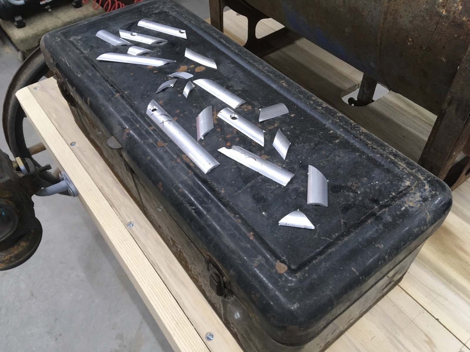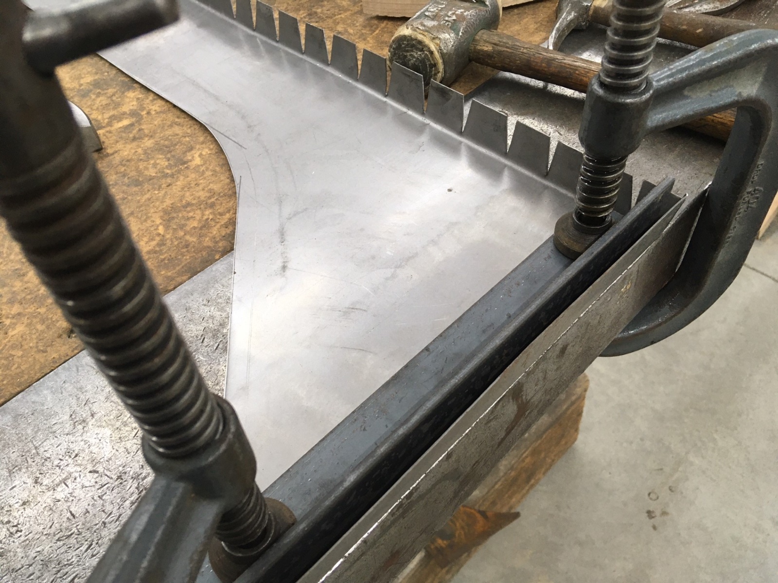 Since I don’t have a 8’ brake at home, I sandwich a 1” flange between two 3/16” strips and knock down with a rawhide hammer, checking to see it is approx. 7 degrees short of 90.