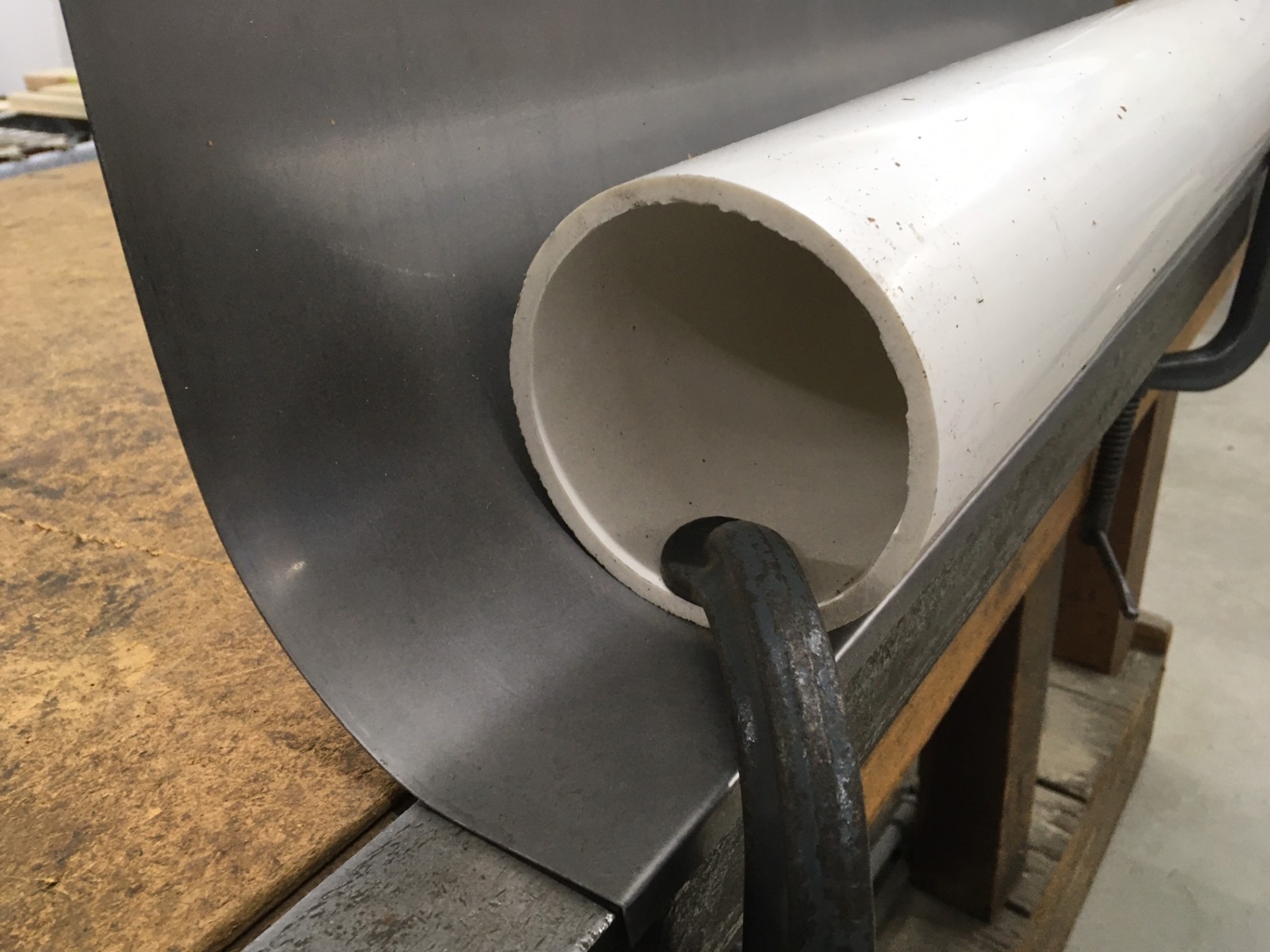 Next knocked down a 3/8” flange and clamped a 4” pvc behind it and pulled the sheetmetal around it to give it the upsweep.