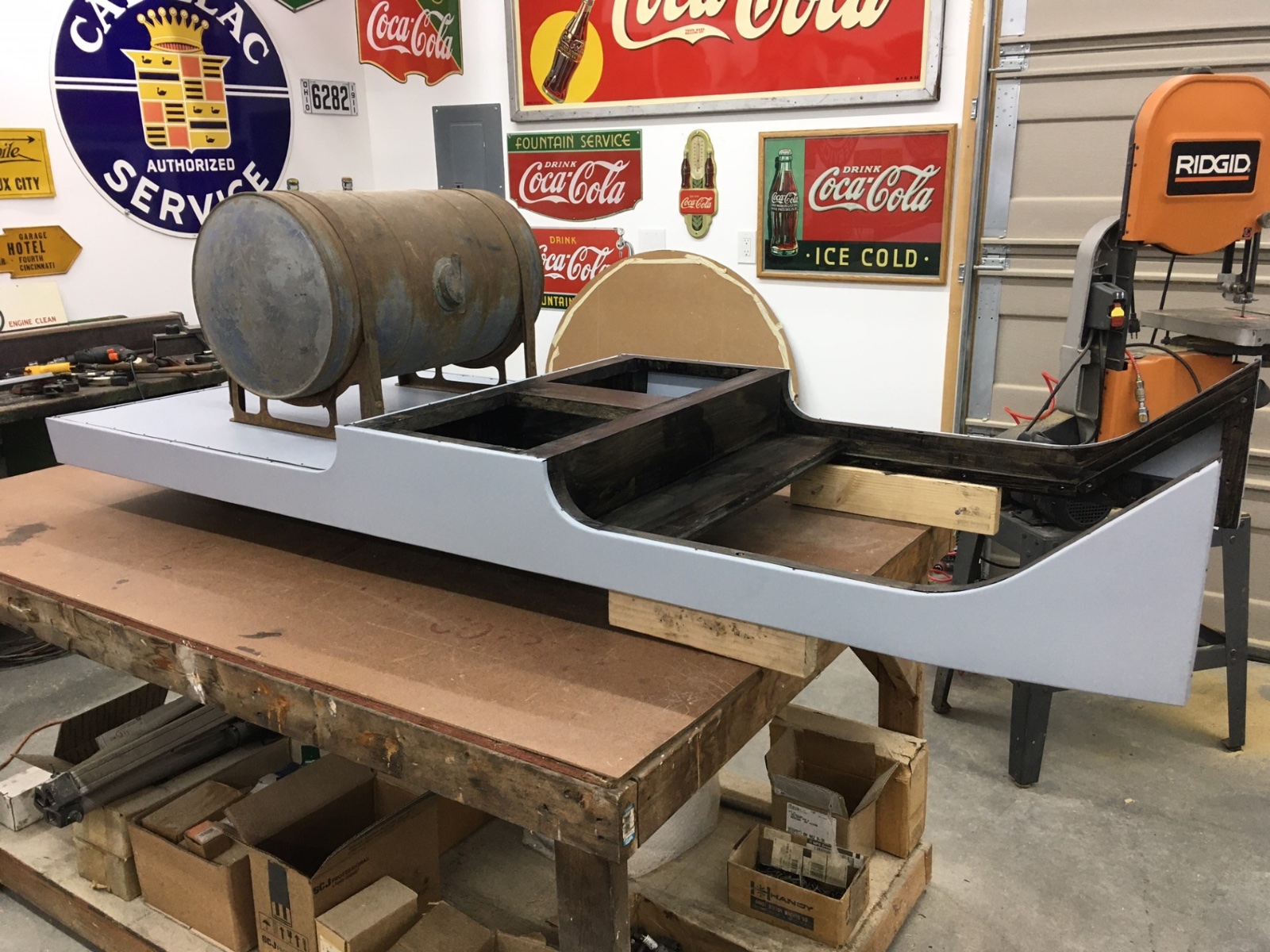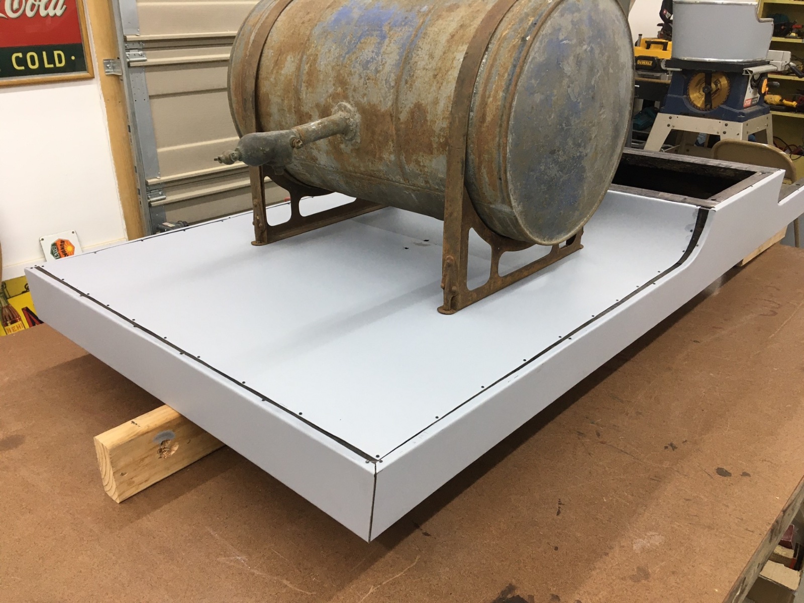 Welded up the rear corners, cut the tank opening and now it’s ready to make the trim pieces.