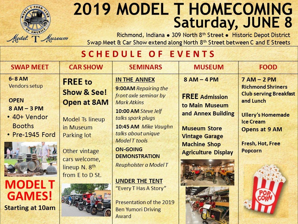Click on this link to register for Swap Meet space, get Hotel listing, more details about the driving tours, etc: [http://www.modeltfordclubofamerica.com/homecoming/]