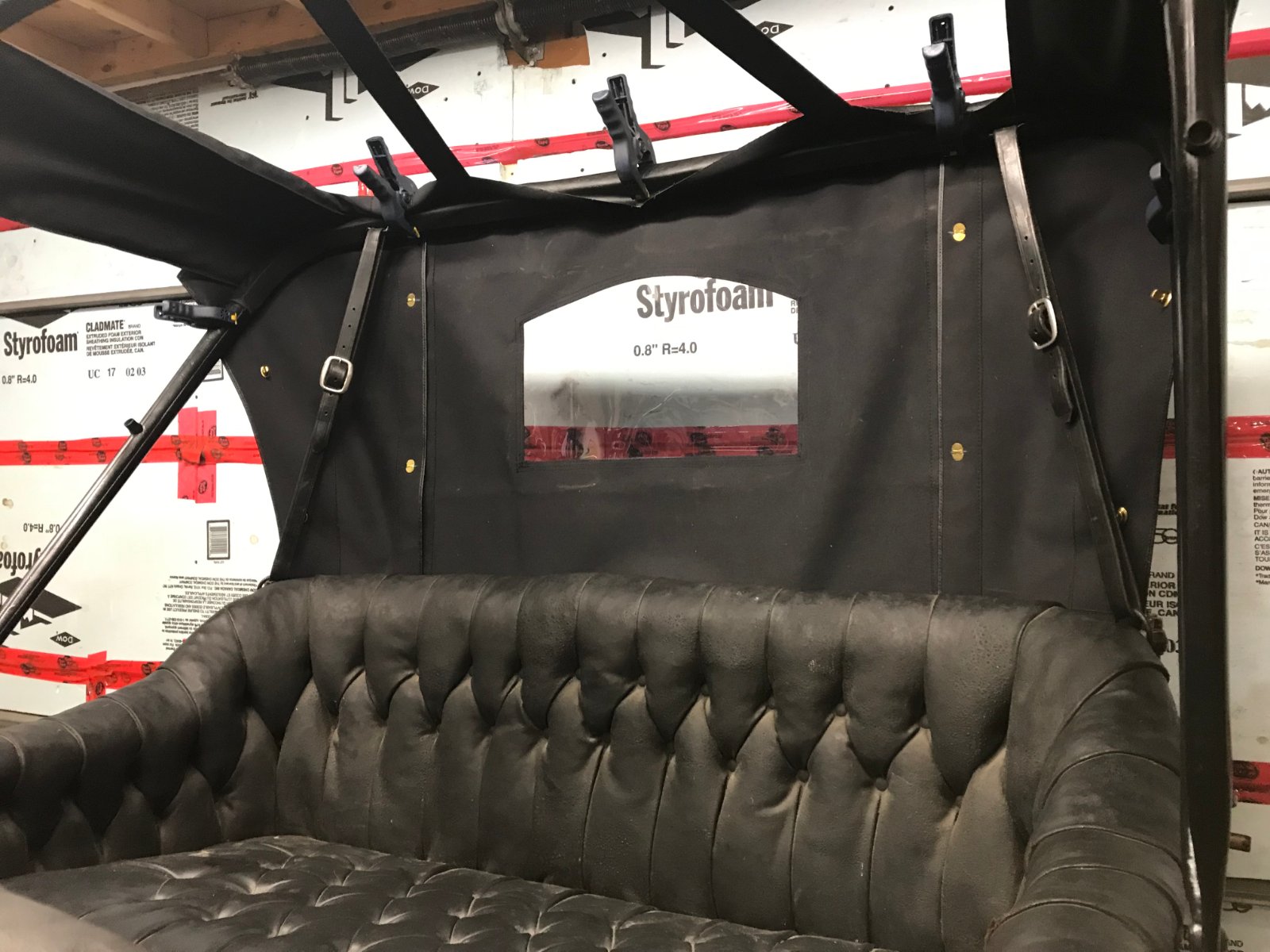 A little more progress....too cold to tack to the bows. Classtique left the Murphy fasteners off of the bottom row so I could match them to the car's original fastener positions. I wonder why they put them on in such a manner?