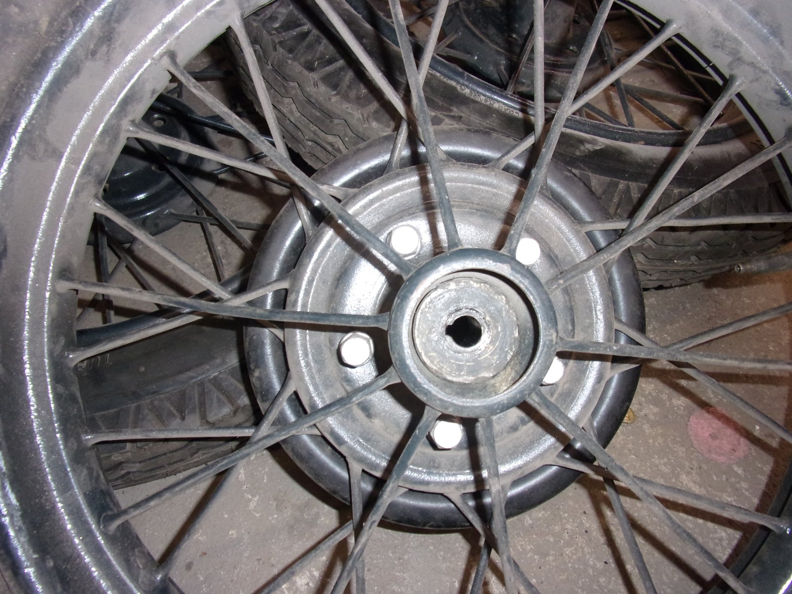 It is my understanding that these wire wheels are a sought after accessory, but not in my case. I want to go with wood spoke demountable wheels. But I have 11" large brake drums on the rear. I've gotta go look at the fronts, but wire wheels and new tires and tubes all the way around. Here are some pics of the rear wheel set up currently and the wheels.