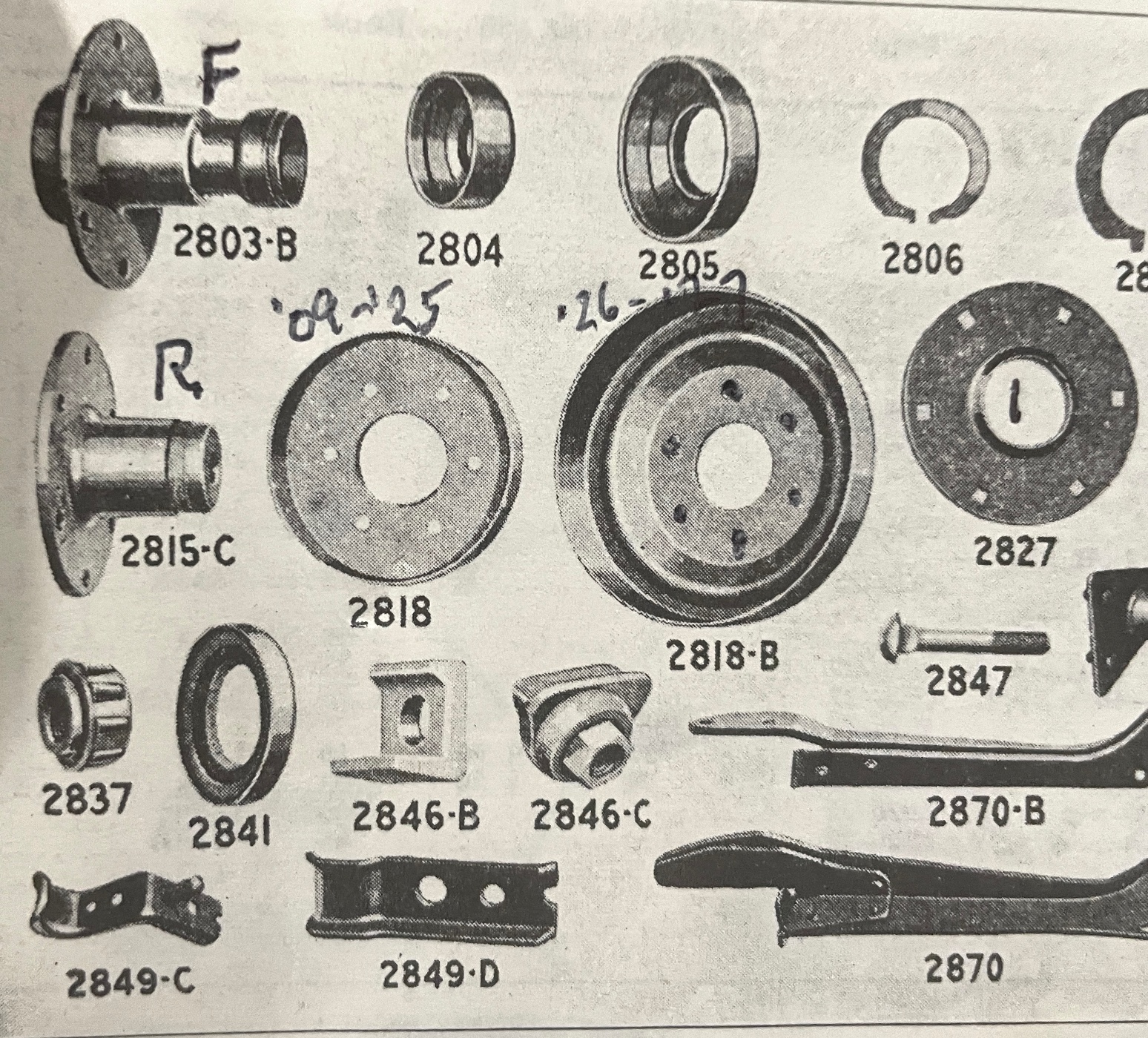 The only thing to change is the '25 and earlier wood rear wheels will have a 'small'rear brake drum p/n2818. Just swap the little drum for the p/n 2818B, the large drum axle brake drum.