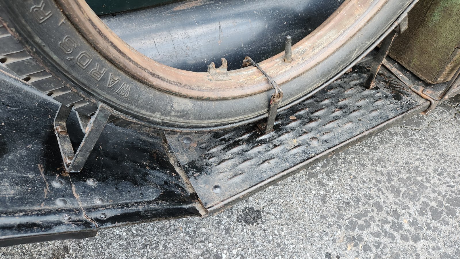 Bill my Roadster backboard is buried in the back corner of my garage, so I can't get photos of it for you. The photos in my post are of Henrietta, my barn fresh tourer backboard. It has a wooden tray which is full width, sitting over and above the rear fenders, and extending forward almost to the front doors. The spare shown is strapped to the front wooden cross member of the flat tray, so the cradle uses the front running board and fender bolts.