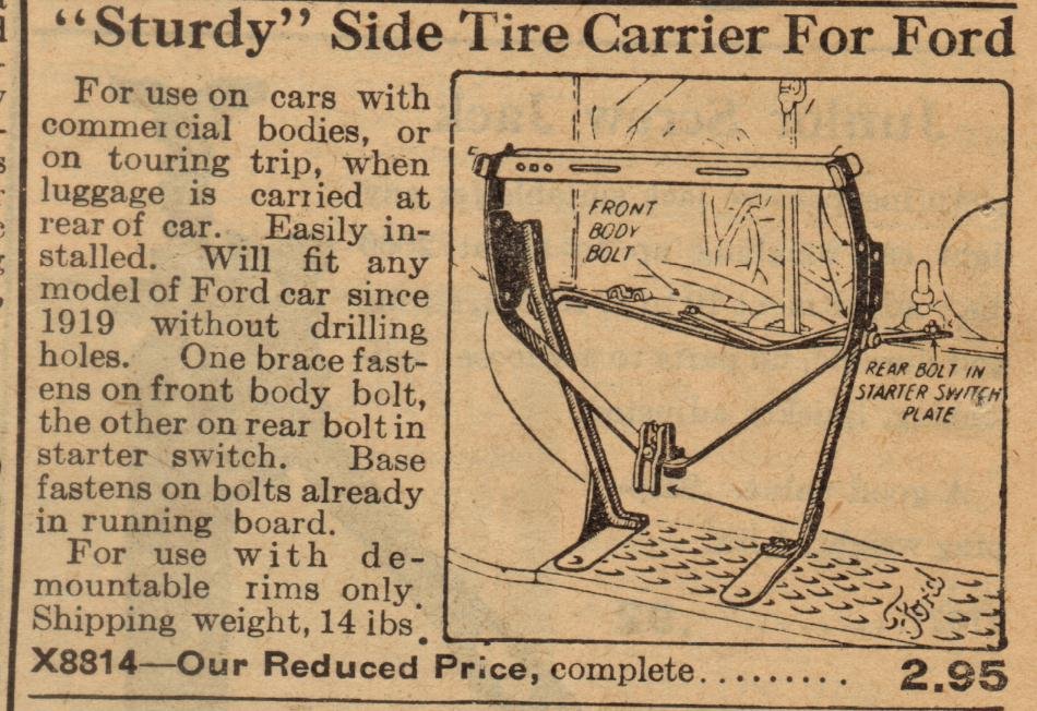 This one I copied from it. The beauty of the design is you need not drill any Ford component to fit it A leather strap holds the tyre/rim in the cradle, and second strap holds the top against the bottom of the top bow. Allan from down under.