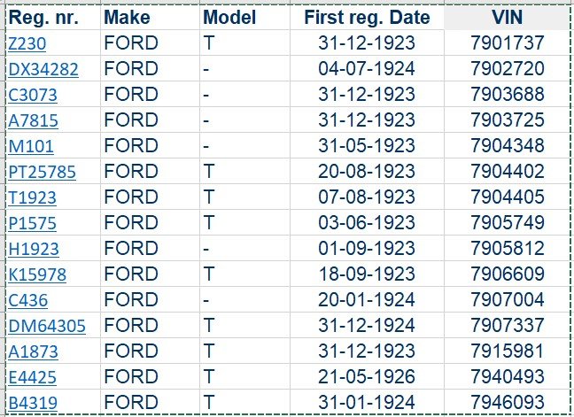 The latter example may be unreadable, but it can be determined that it is a number in the 7.980.???. Just for the fun of it, I tried to seach the danish vehicle register for Fords older than 1928 with serial numbers in the neighborhoodof 7.980.??? and found: