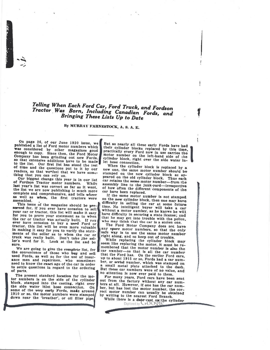 "Motor number was first placed on frame side member R.H. on Dec. 12, 1925. Motor No. 12,861,044. Information obtained from Mr. Burns, Final Assy., Highland Park."