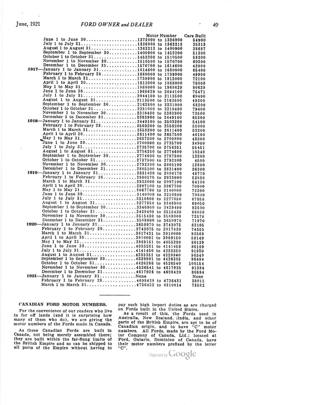 1. Please remember that the date listed in Bruce McCalley's (R.I.P.) serial number listing which is the normal reference we use for USA produced engines is the date the engine number was entered in the USA Ford Motor Company daily log books of the engine assembly department starting in Jan 1915 and continuing to 1941 (ref page 501 and 537 of Bruce's book "Model T Ford").