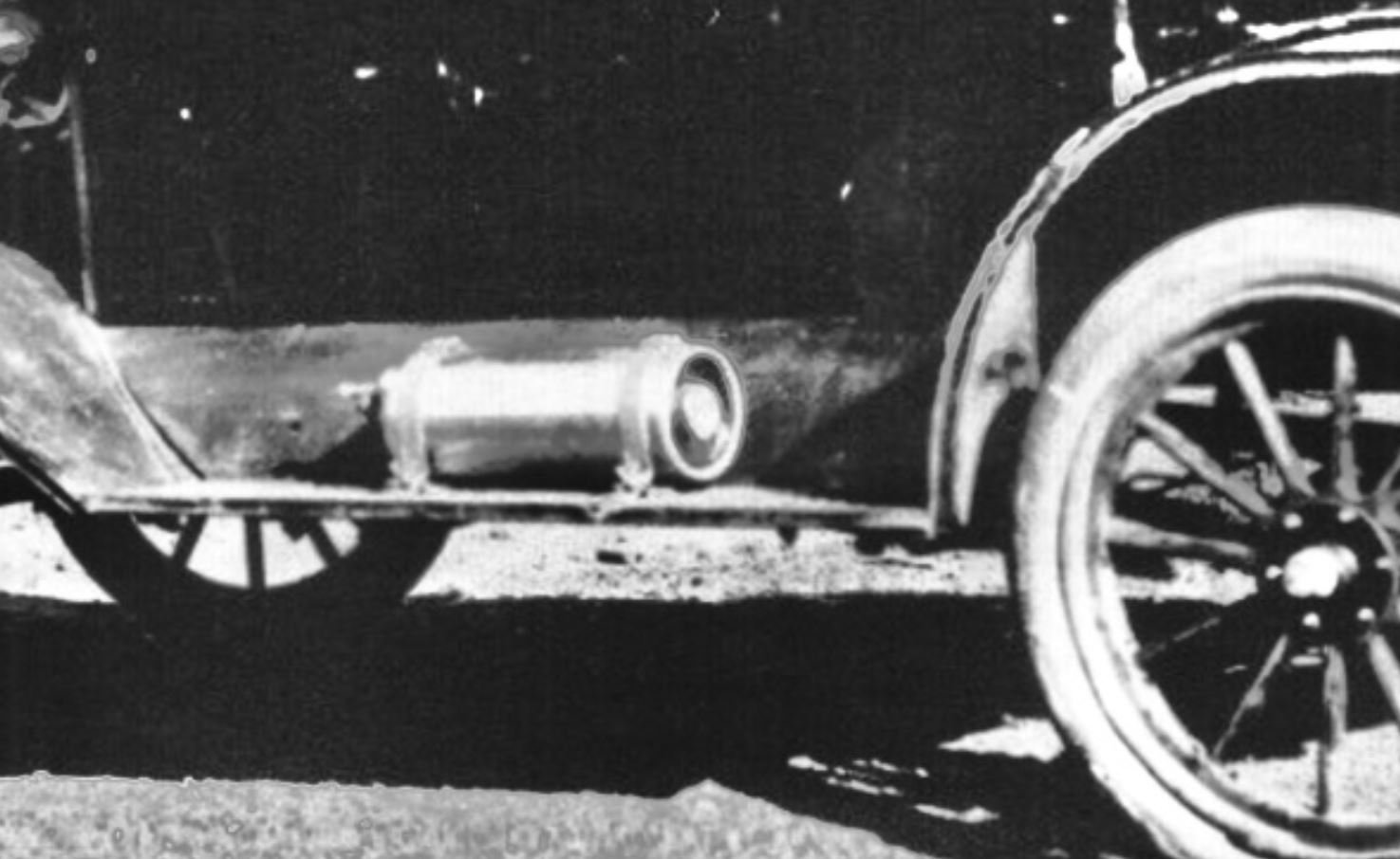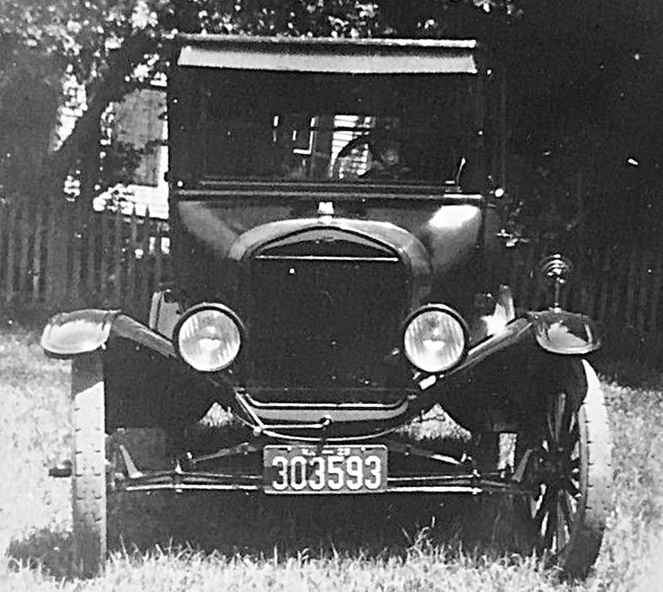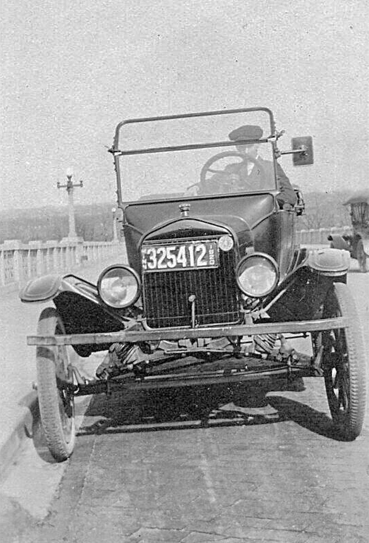 The car is very apparently a 1915 or 1916, with the brass radiator covered by an after-market updated shell and tapered hood. Often, but not always, that update would keep the 1915 style flat front fenders. But not this car. Whether those are after-market curved front fenders, or later 1917ish front fenders? I cannot tell for certain. The definition in that area is not great, but they appear to me to likely be 1917ish front fenders (some of the more common after-market curved front fenders had a slightly different curve to them).