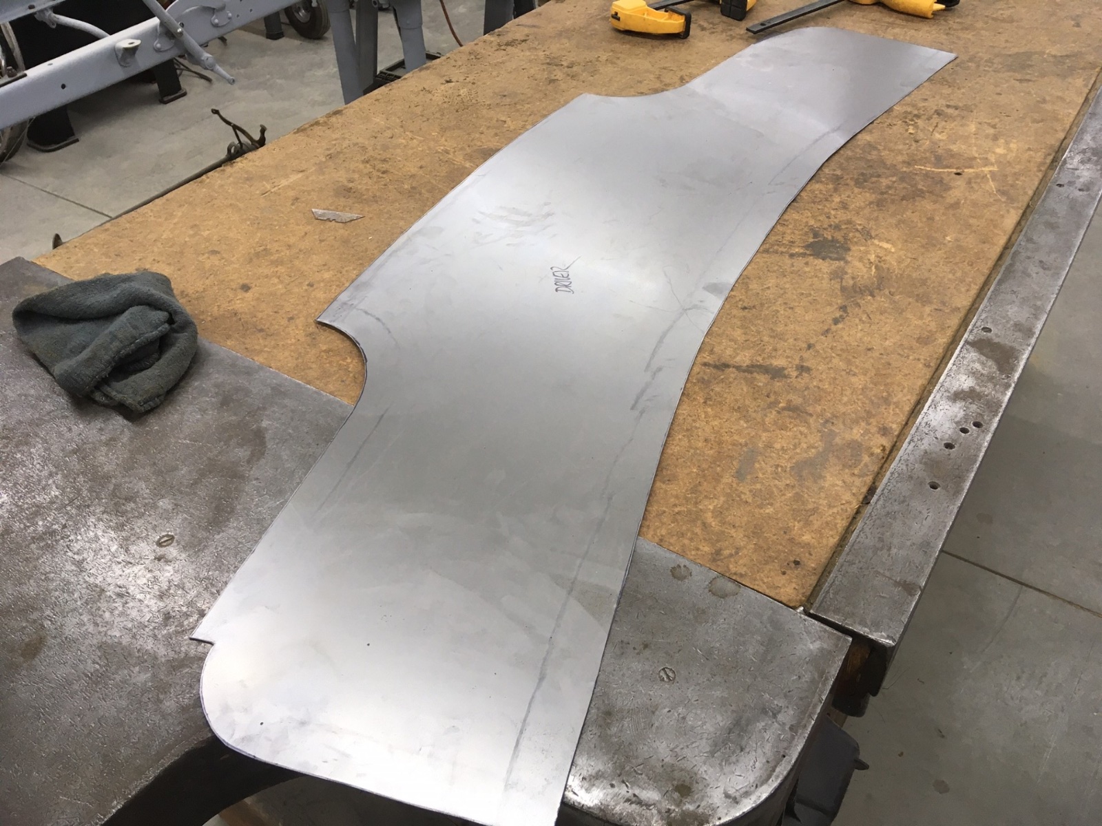 I use an electric hand shear to cut out the part.Using the strips I knock the straight stretches up with the rawhide and then straighten the edge with a steel face hammer and dollie.