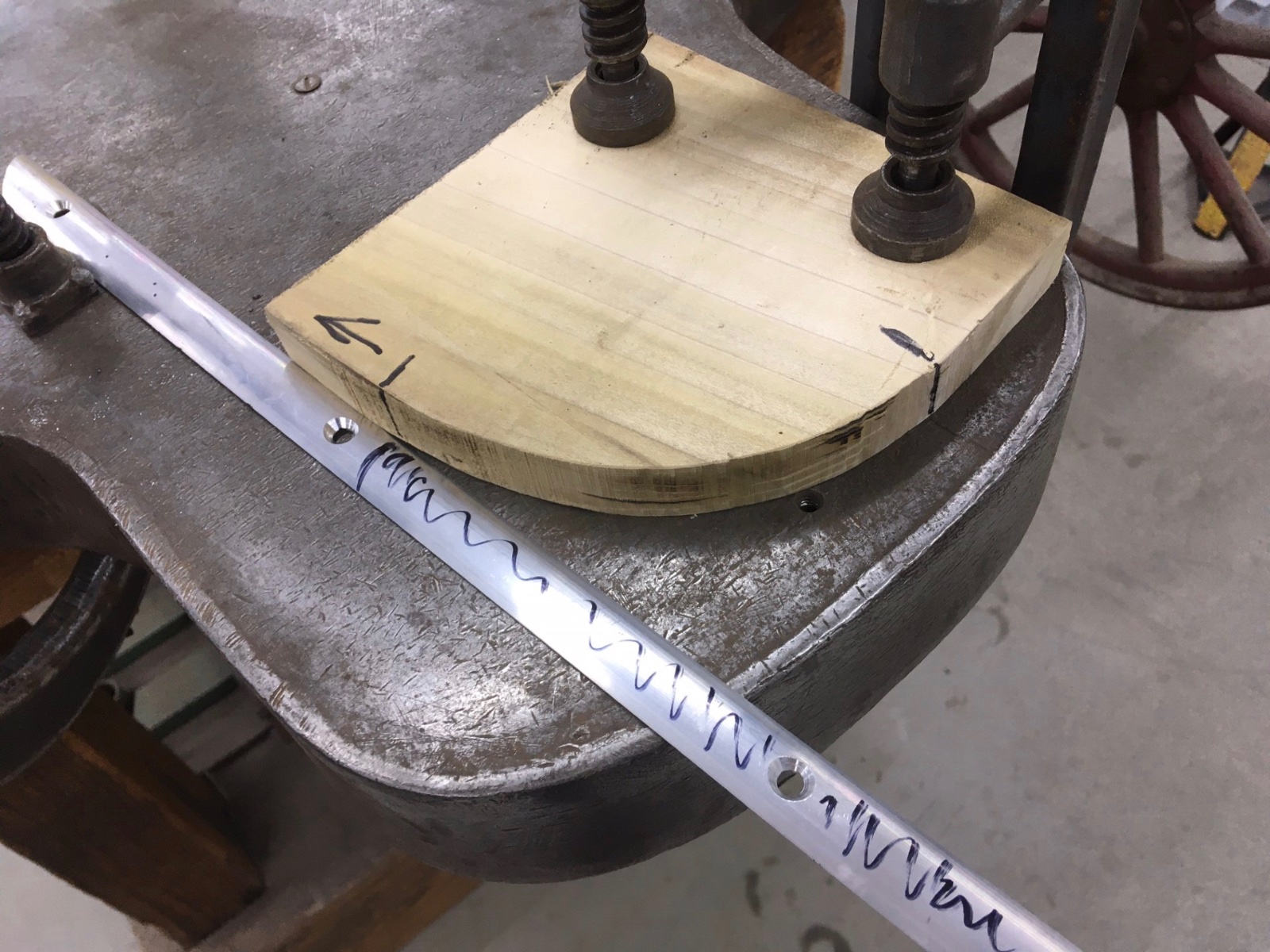 I had to bend aluminium moldings for my 1912 van and my 1925 wide body roadster, and used a wooden former like yours for each, but with a slight difference in technique. I cut the formers to the OUTSIDE diameter of the curve needed. Then I used my table saw to cut a grove around the curve. The cut was set to the depth of the molding width. I had to do two cuts side by side to get the groove as wide as the molding was thick.