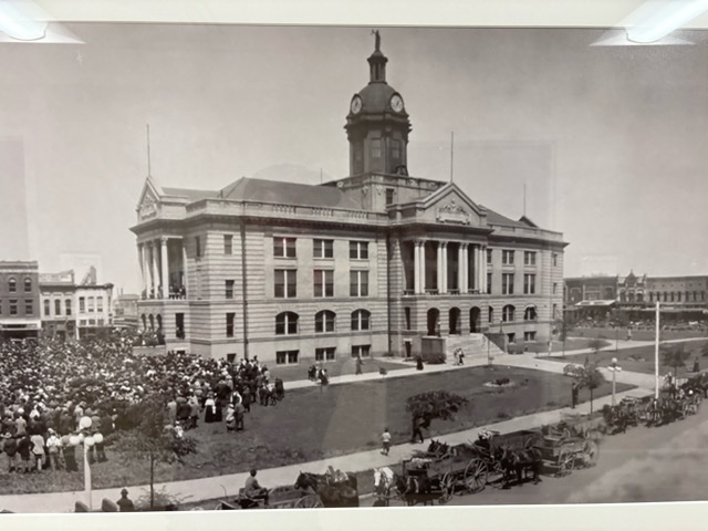 It’s supposed to be a modern design. I read a story about it one time saying that one of the judges or commissioners had a friend in the construction business and whatever went on resulted in the new courthouse. The first one was built in 1910, here is a picture of it being demolished in front of the new one in 1955.