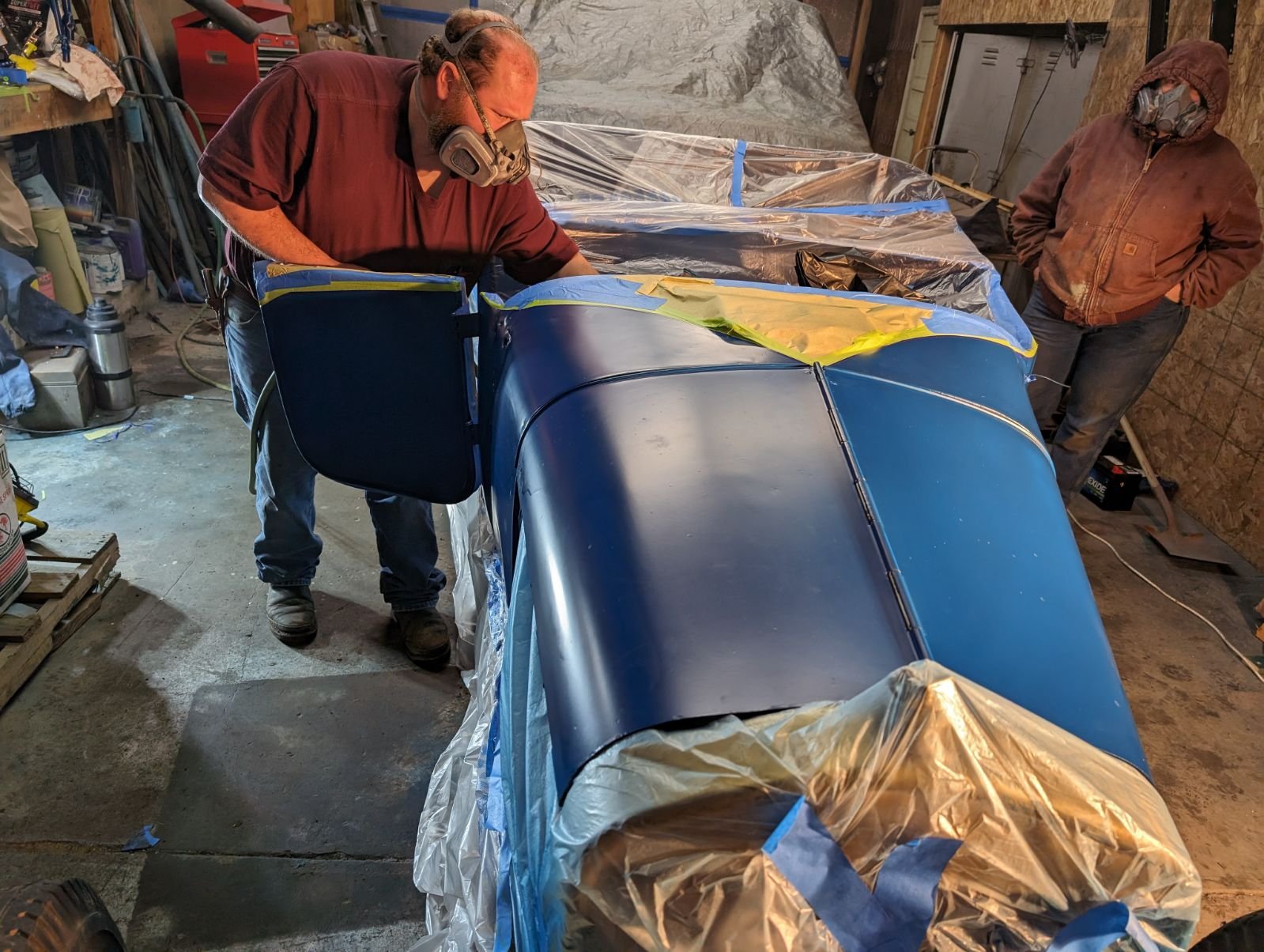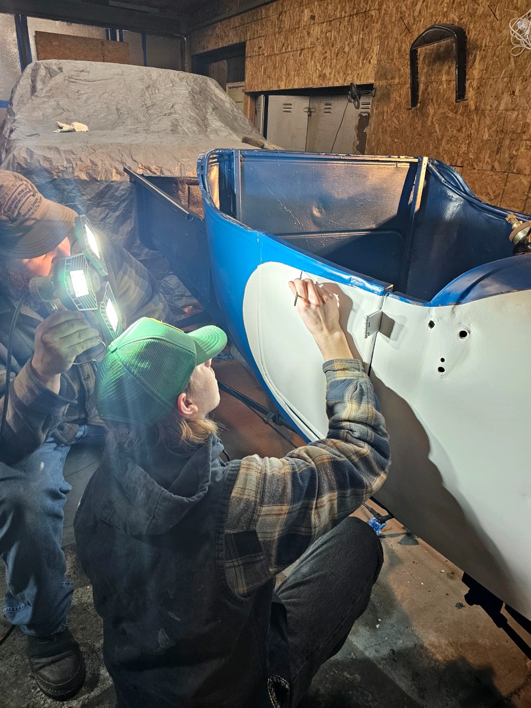 20240221_115922.jpg[/attachment Life has been busy, Carston has grown up. He is in high school now a junior. He is a life scout in Boy Scouts of America and almost done with his Eagle scout rank (HOO-RAY!!), and also a member of 4H and FFA. So here we go again.... for his senior project next year Carston wants to update Nuthin' Special; Bodywork and paint a better interior custom hood, new glass, but most importantly a rebuilt engine with some go fast goodies, Warford over drive, 3.25:1 gearing in the rear axle, and rocky mountain brakes. We have a year! Carston's auto shop teacher invited Carston to bŕing his T to represent his high school at the High School challenge, during the Portland Roadster Show. Quite an honor! SO HERE WE GO...... So we needed to get it out of storage and get it running. First thing was to get a battery, then we went through and cleaned the ignition system and tried to start it, no go. We found the carburator was not working right, so Carston tore the carb apart and found it was plugged with varnish. We are waiting for a rebuild kit. In the meantime Carston wants his T to look better for the Roadster Show....well duh?! Last week started to do some body work and fixing things such as windsheild (at the glass shop, should be done next week.), and floorboards. Today Carston and his mom Melissa, did the major body work and I made some new floorboards ( took way to long as I am not a wood worker!!!), made patches for the rusted out pickup box corners and pop riveted them in place. Finally we masked up the outside of the box and sprayed the inside with Raptor spray in bed liner. Tomorrow's plan is to shoot the body with a dark satin blue oil based equipment enamel at the end of the day. I need to fill in a crack in the water jacket with some JB weld and clean up the under carriage for a quick rattle black paint job, while they mask up the body for pàint. [attachment=1]Screenshot_20240224_215646_Chrome.jpg