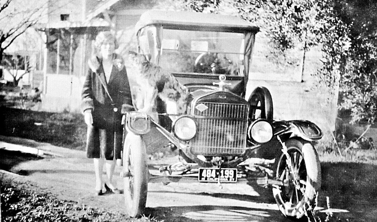 Photo number six, the flapper standing by the side with her dog on the fender (my first glance I thought it was a racoon coat!) of the touring car. The car appears to be about 1922, shiny and nice, with pancake Hasslers, front fender braces, a triple A radiator badge, and a neat dogbone cap and Motometer! A pretty nice looking model T for about five years old! The car has a 1927 California license plate!