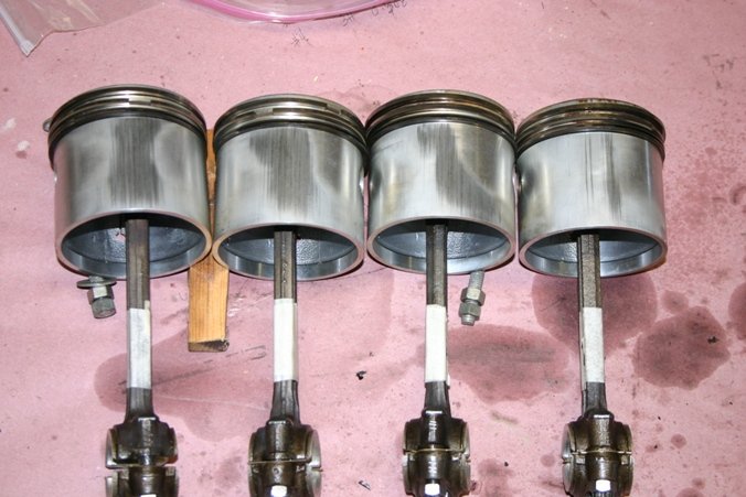 You can see that the wear pattern is generally down the center of the pistons. #1 is well cenetered, but #2,3,4 on the split side show wear more on the left of center side. Then on the non split side, only #3 show off center wear. Could this wear be the result of slightly bent rods?
