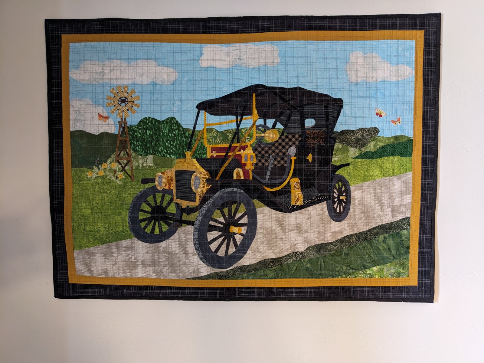 I can't say that I've done anything on our two T's, as they are still on jacks for the winter, but my wonderful wife finished this wall hanging quilt of our 1911 touring that we restored for my birthday at the beginning of the month. She used the picture below it as the inspiration.